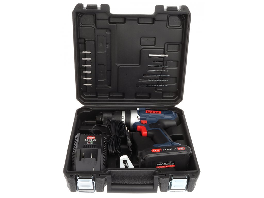 Vybavenie: Li-Ion akumulátor 18 V/2,0 Ah; nabíjačka 3,0 A/h; súprava vrtákov, 6dielna (HSS; ø 1,5-2,5-3,0-4,0-5,0-6,0 mm); sada bitov, 6dielna (Cr-V; ø 5-6 mm, PH1, PH2, PZ1, PZ2); plastový transportný kufrík.