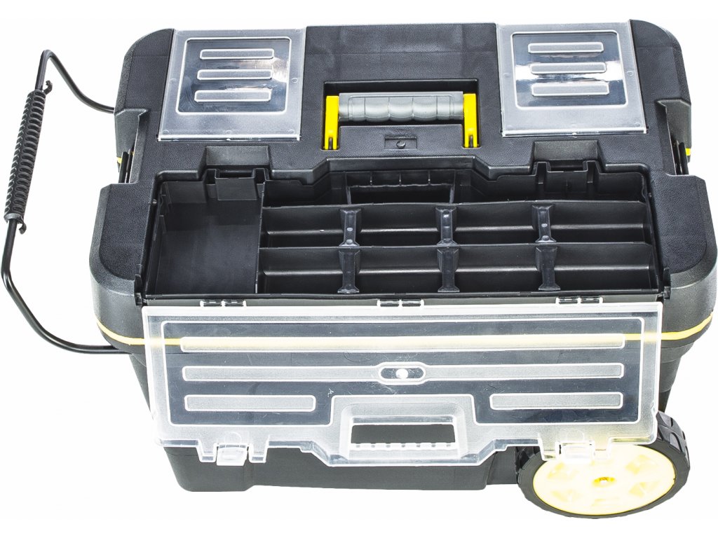 Jednoduchá manipulácia vďaka rukoväti a 2 kolieskam s gumovými obručami. Box obsahuje odnímateľné horné veko so vsadeným sklopným držadlom a 3 priehradky na drobný spojovací materiál, odnímateľnú vaňu s pevným držadlom. Rozmery 620 × 375 × 420 mm.