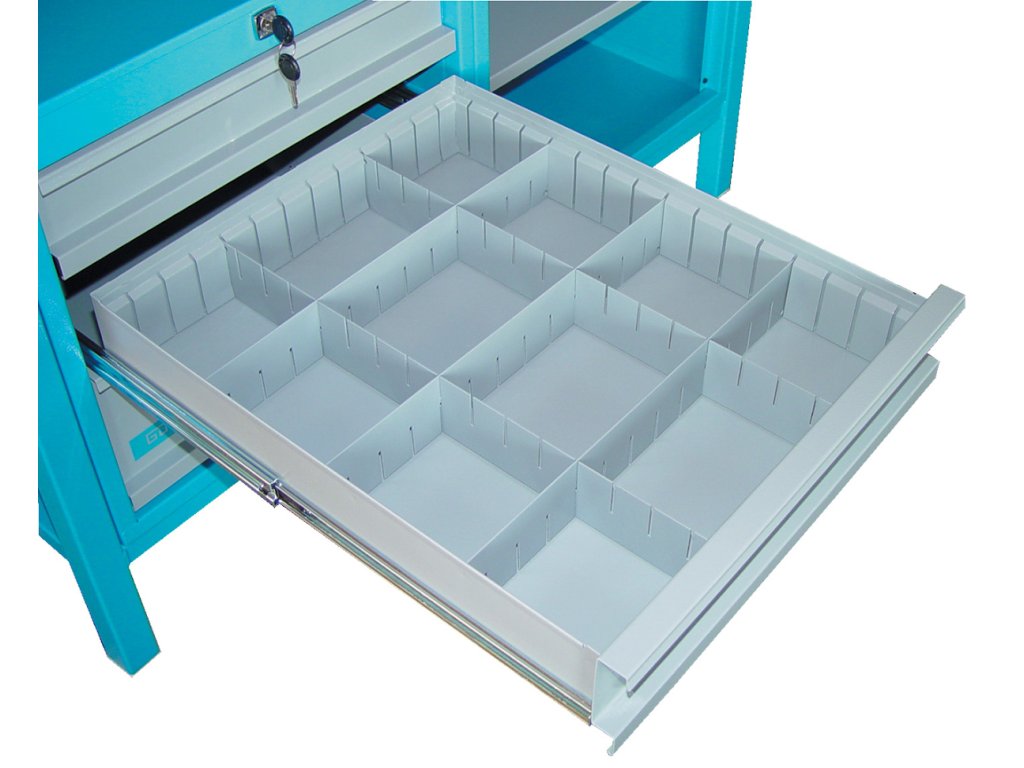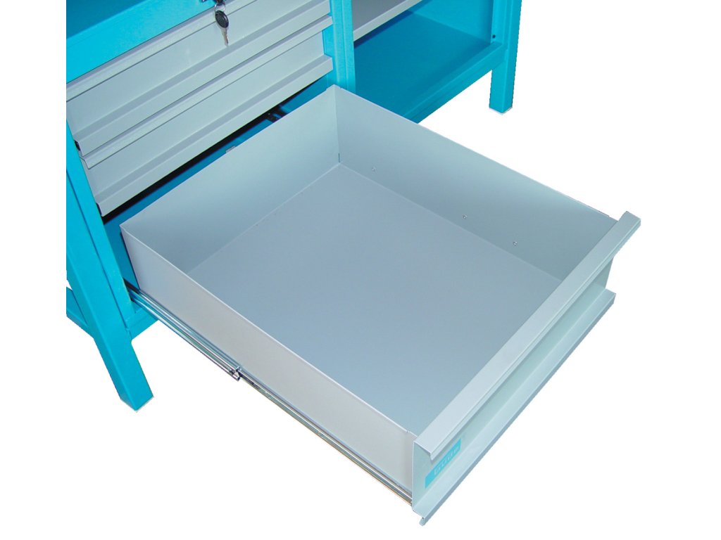 Vybavenie: 3-zásuvková uzamykateľná skrinka (2 zásuvky - výška: 85 mm/1 zásuvka - výška: 165 mm; centrálne uzamykanie cylindrickým zámkom - 2 kľúče; úplný rozsah vyloženia všetkých zásuviek v celej dĺžke; pohyb zásuviek v profesionálnych vodiacich lištách; vrchný pripravené na použitie vnútorných deliacich priečok).