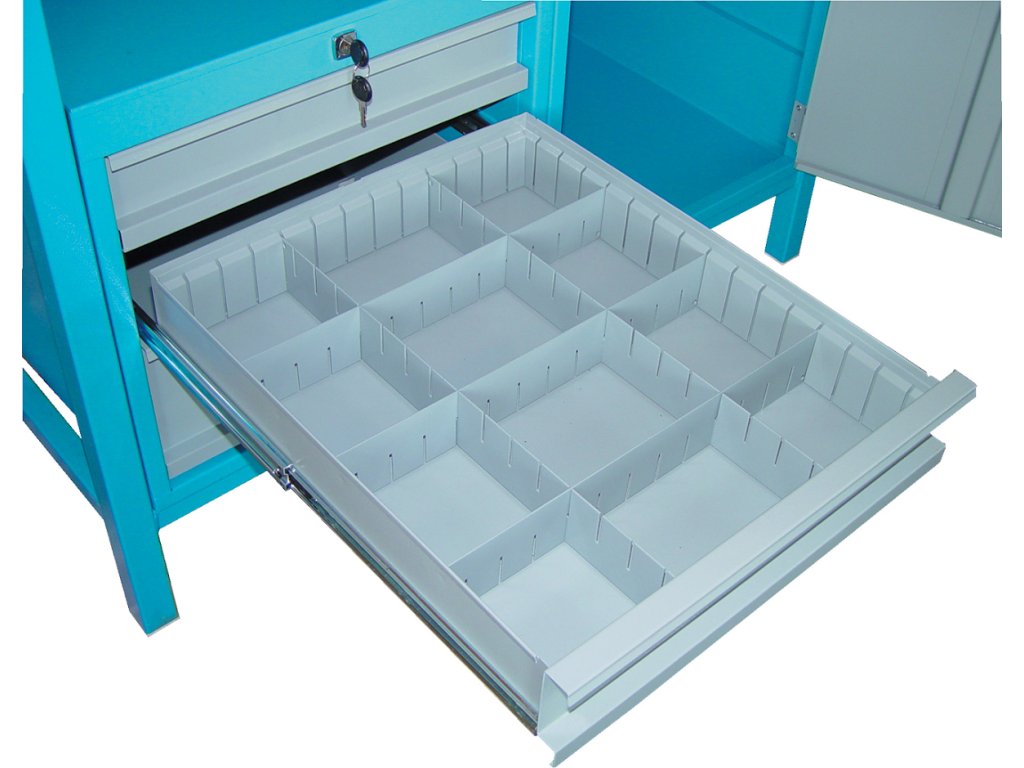 Vybavenie: vrchný zásuvkový diel (→ 2 menšie zásuvky, rozmery š × h × v: 430 × 520 × 85 mm, vrátane univerzálne nastaviteľných priehradok: 3 pozdĺžne/3 priečne deliace priečky).