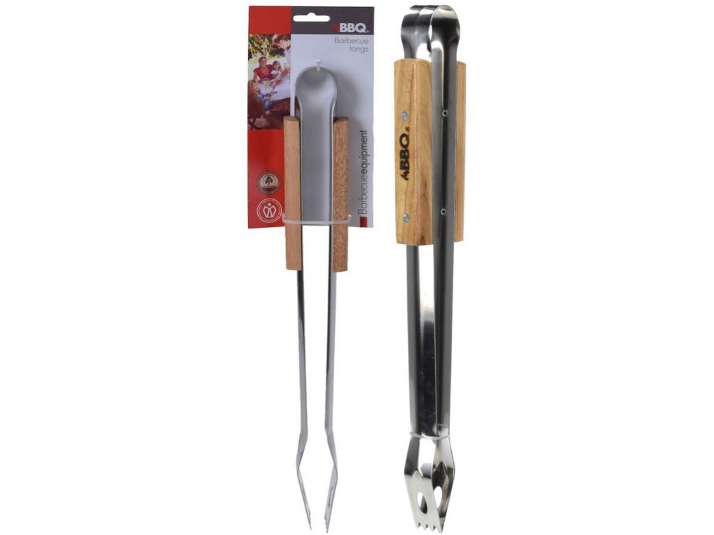 Grilovacie kliešte 40,5 cm BBQ nehrdzavejúca oceľ, drevená rukoväť