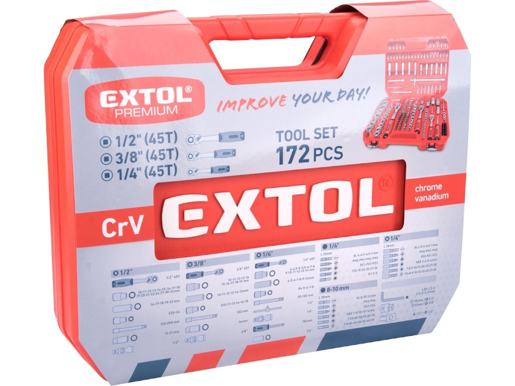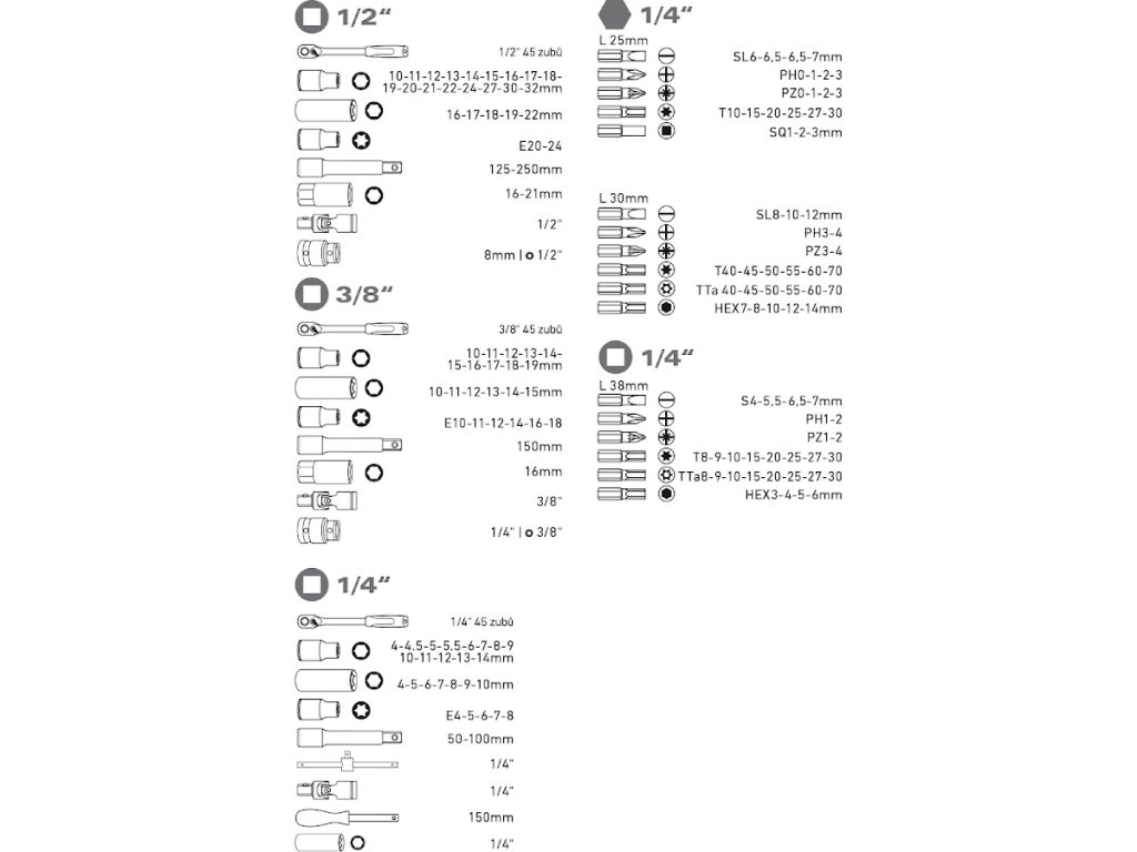 - hlavice nástrčné: 1/4": 4 - 5 - 5,5 - 6 - 7 - 8 - 9 - 10 - 11 - 12 - 13 - 14 mm, 3/8": 10 - 11 - 12 - 13 - 14 - 15 - 16 - 17 - 18 - 19 mm, 1/2" 10 - 11 - 12 - 13 - 14 - 15 - 16 - 17 - 18 - 19 - 20 - 21 - 22 - 24 - 27 - 30 - 32 mm