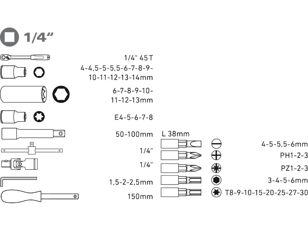 - hlavice nástrčné: 1/4": 4 - 4.5 - 5 - 5.5 - 6 - 7 - 8- 9 - 10 - 11 - 12 - 13 - 14 mm