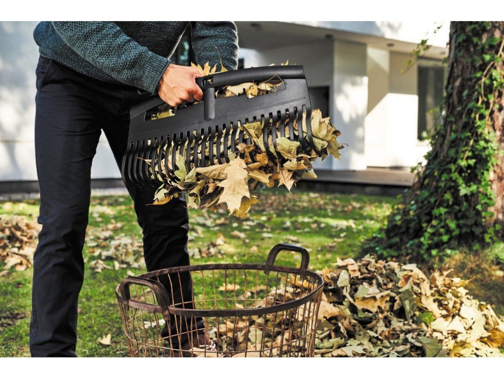 Hrable na lístie - hrebeň - šírka pracovnej plochy 52,5 cm - plastový materiál - hrebeň na hrabanie listov, trávy a iného záhradného odpadu na malých a veľkých plochách - Flexibilná, vymeniteľná hlava vyrobená z odolného plastu, funguje ako manuálna hrable, na prepravu listov do kolieska alebo kompostu - Jedinečný tvar znižuje upchatie zubov a zaisťuje hladkú, efektívnu a pohodlnú prácu Čakáte opäť na nepríjemné hrabanie listov? Na listoch a suchej tráve je tento hrebeň absolútne jedinečný. Môže sa použiť na ručné prenášanie listov a suchej trávy do kolieska alebo na kompost, alebo na prichytenie na rukoväť hrable, ktorú si môžete objednať pre hrebeň pod katalógovým číslom 745053.