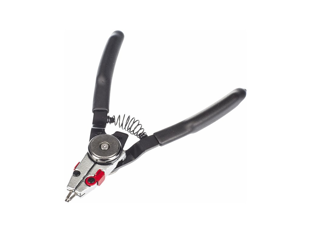 Prepínateľné na vnútorné aj vonkajšie poistné krúžky. Vymeniteľné čeľuste rovné, priemer 1,2 a 1,8 mm, aj zahnuté 90°, priemer 1,2 mm. Vyrobené z kvalitnej uhlíkovej ocele, ochranné návleky, balené v blistri.