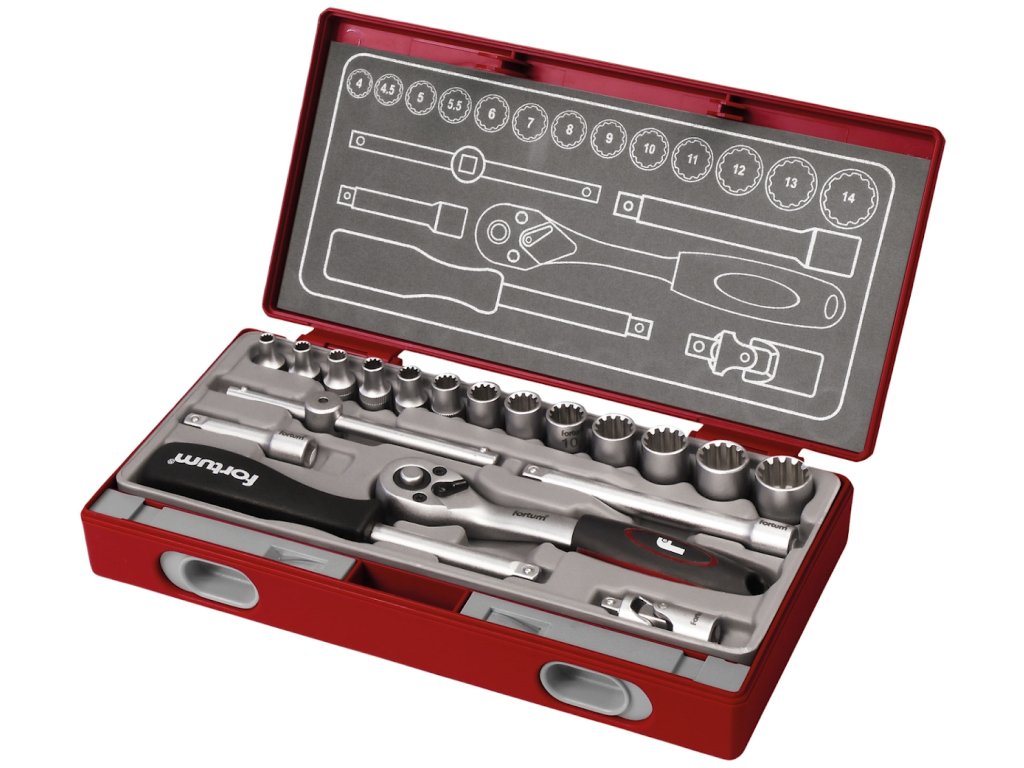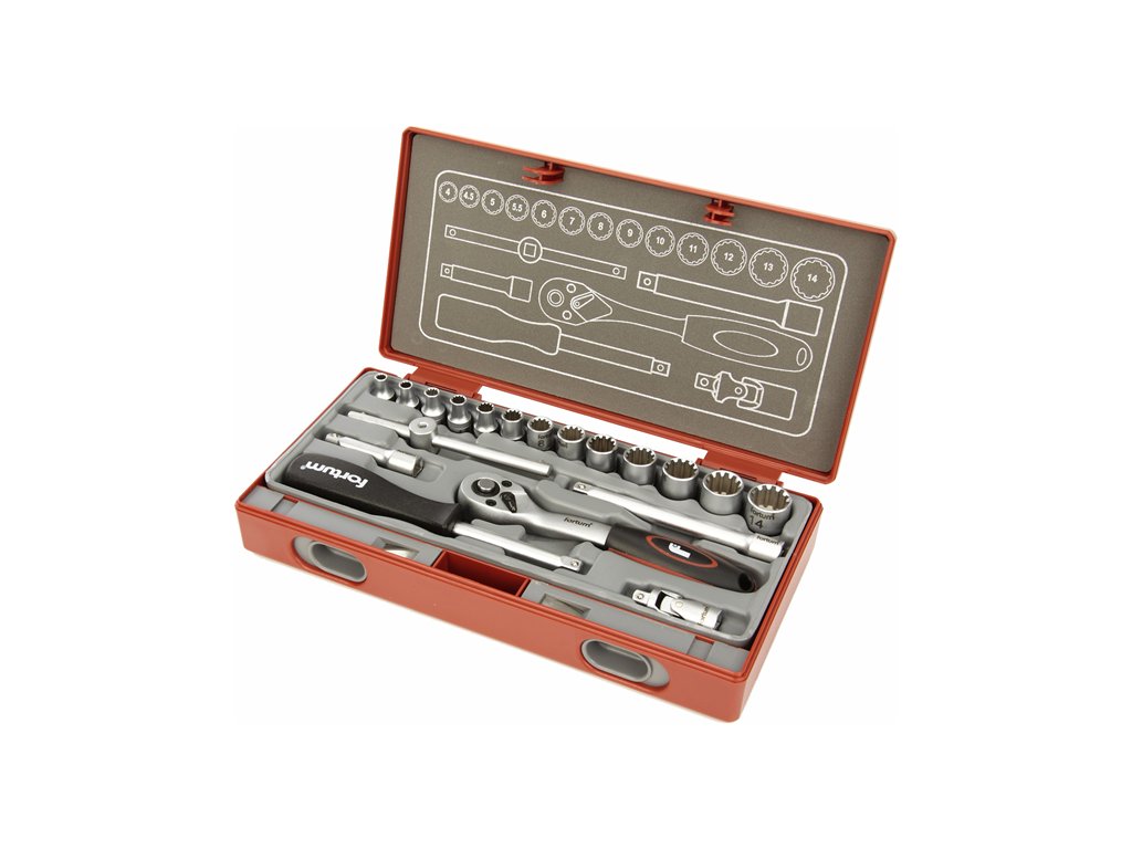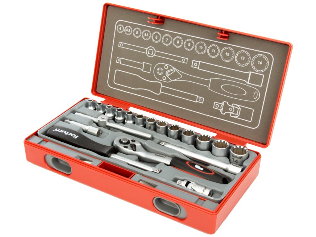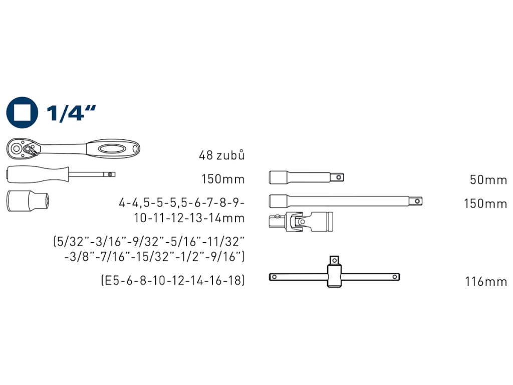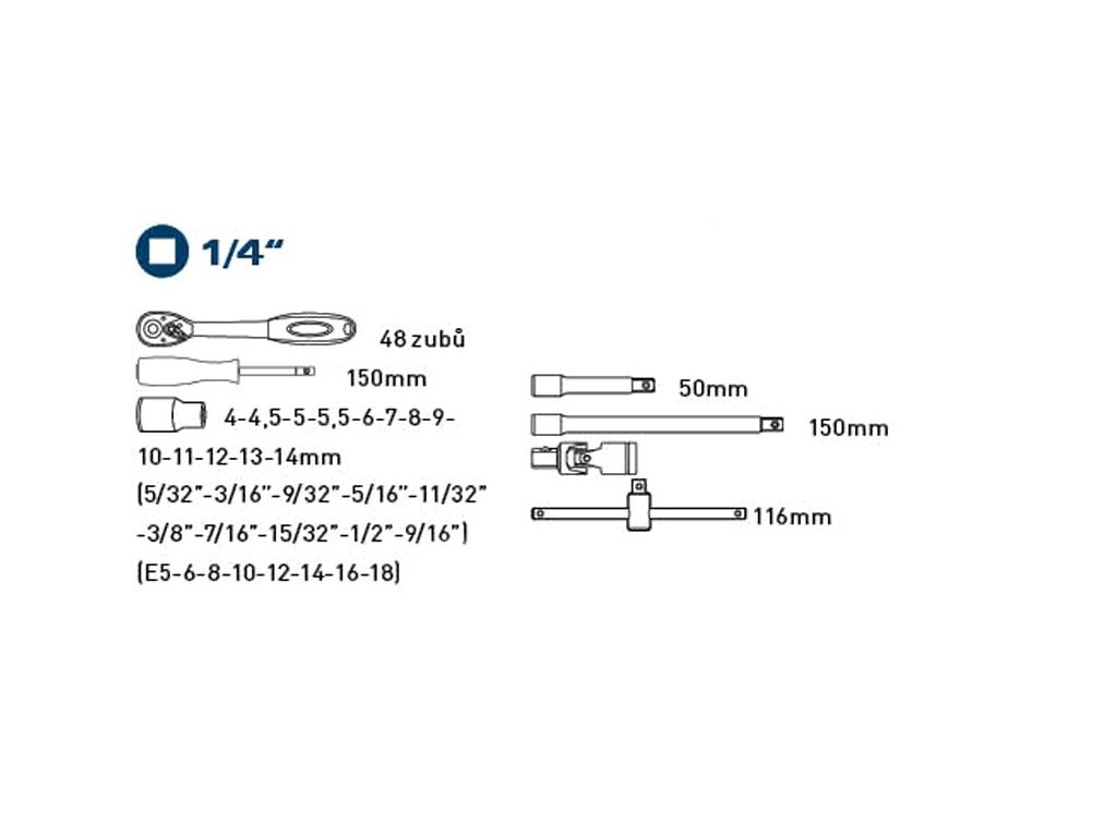 Hlavice 1/4“ 4; 5; 5,5; 6; 7; 8; 9; 10; 11; 12; 13; 14 mm, 1x račňa 72 zubov, 1x nadstavec 50 mm, 1x nadstavec 150 mm, 1x nadstavec s rukoväťou 150 mm, 1x kardanový kĺb, 1x adaptér 1/2“ pre vratidlo.
