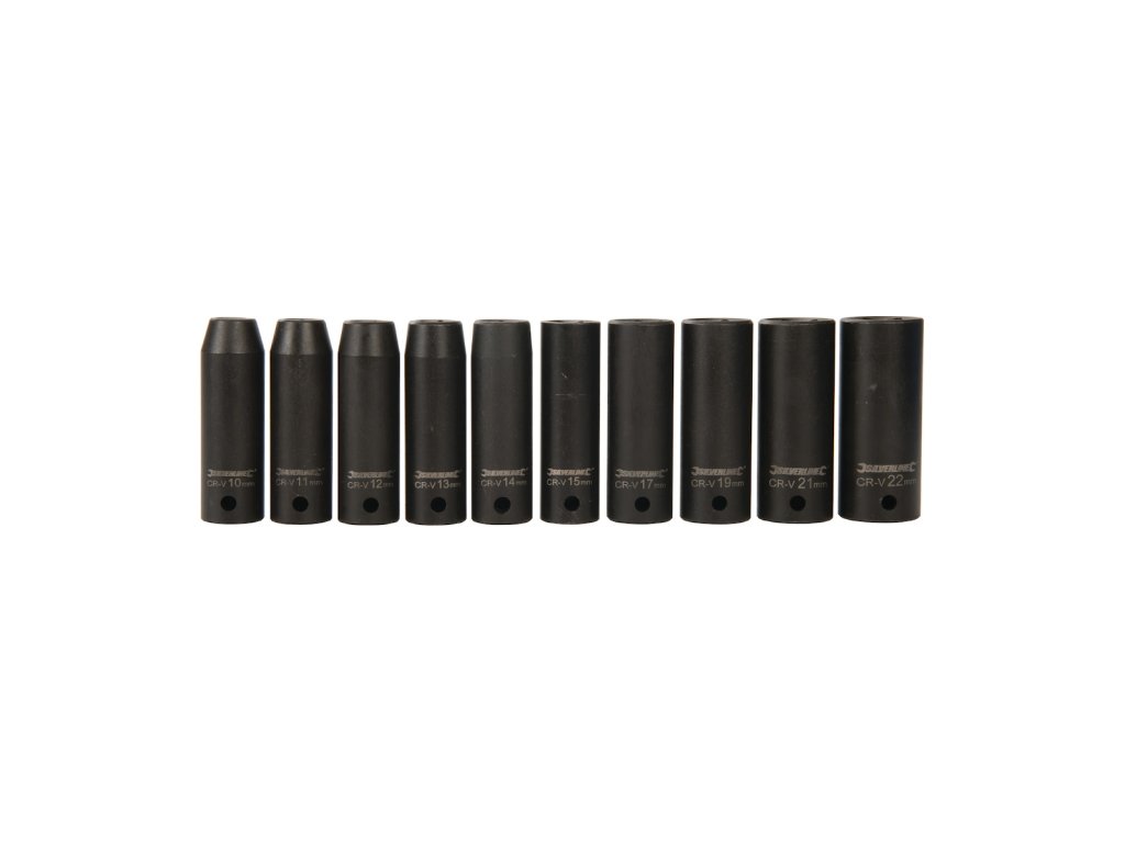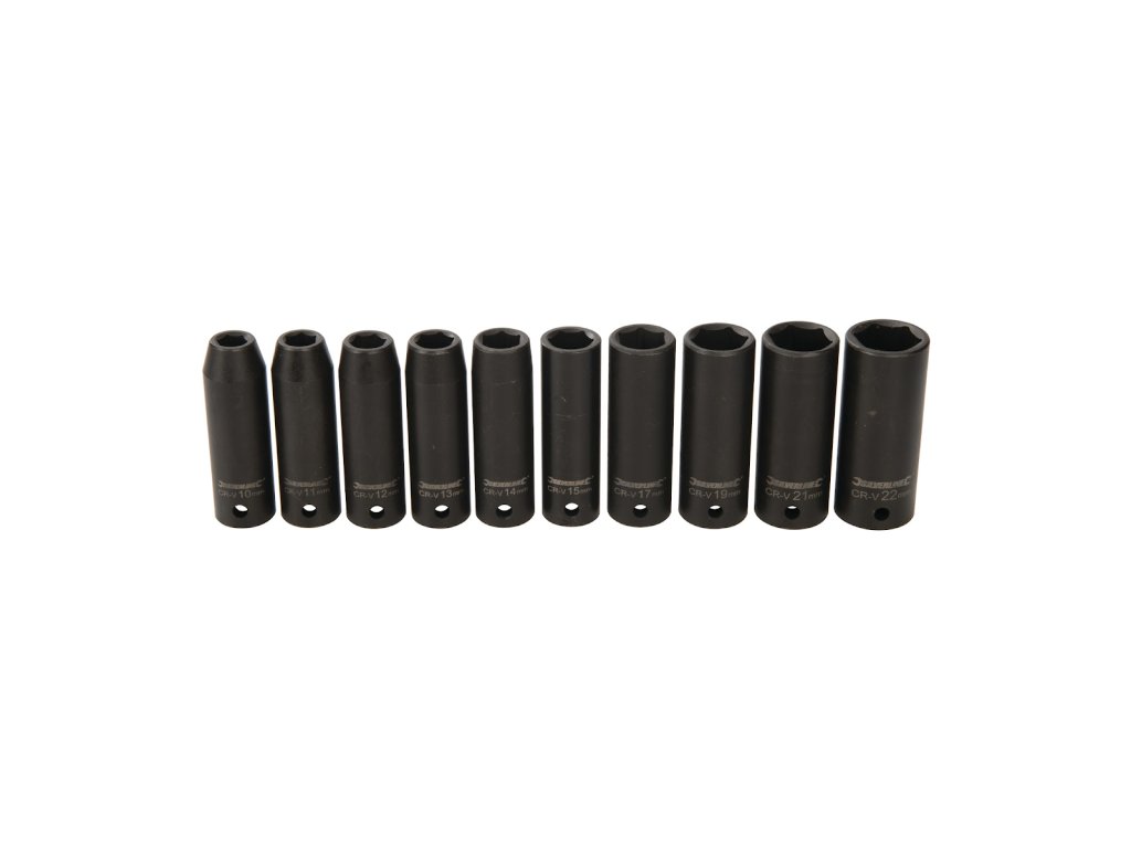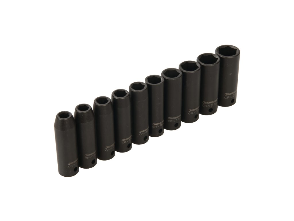 Šesťhranné nástrčné kľúče pre použitie na rázových nástrojoch. Presná, za studena kovaná, tvrdená chróm vanadiová oceľ. Čisté, laserom leptané veľkosti a parkerované, odolné proti korózii. Silné steny poskytujú silu a trvanlivosť pre opakujúce sa vysoké krútiace momenty. Otvor pre zaistenie kľúče k nástroju. Obsahuje kľúče 10, 11, 12, 13, 14, 15, 17, 19, 21 a 22 mm, dodávané v plastovej kazete.