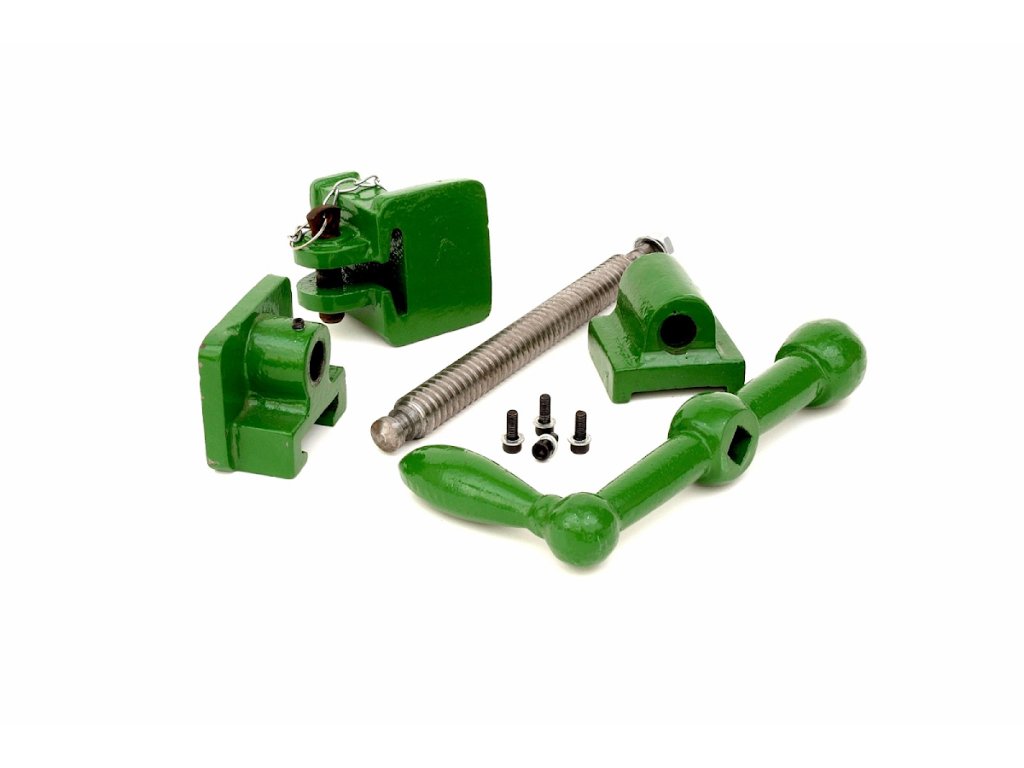 Súprava kovania pre stolársky sťahovák – knecht. Obsahuje kľuku, skrutku, maticu na priskrutkovanie na koľajnicu a dve čeľuste.