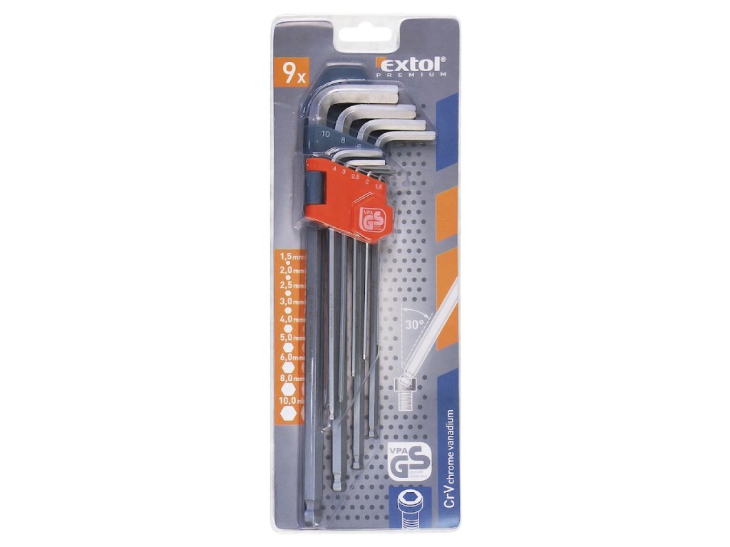 L - kľúče IMBUS predĺžené, sada 9 ks, s guličkou, 1,5 - 10 mm