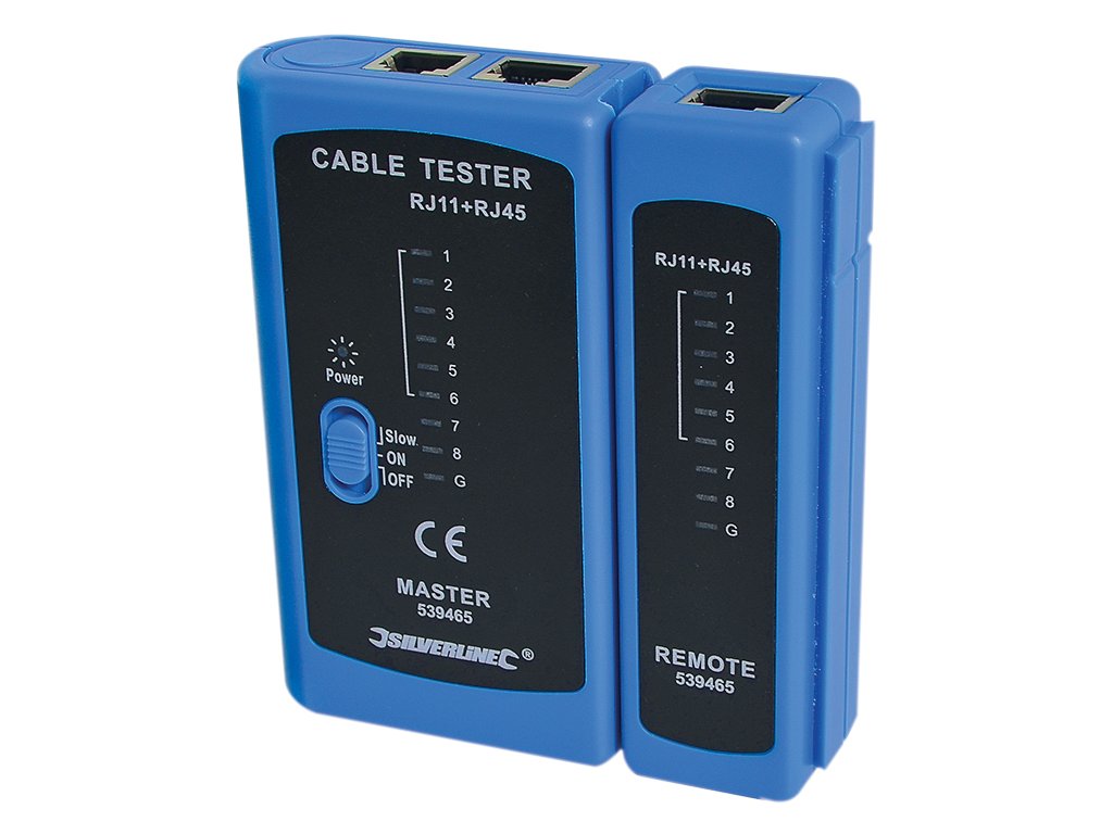 Ručný tester pripojenia k sieti LAN pre káble RJ11, RJ12 a RJ45. Indikuje chyby pripojenia, skraty a prerušené obvody. Štandardný a pomalý režim zobrazenia. Obsahuje hlavnú a vedľajšiu jednotku. Vyžaduje 1 ks 9V (PP3) batérie.