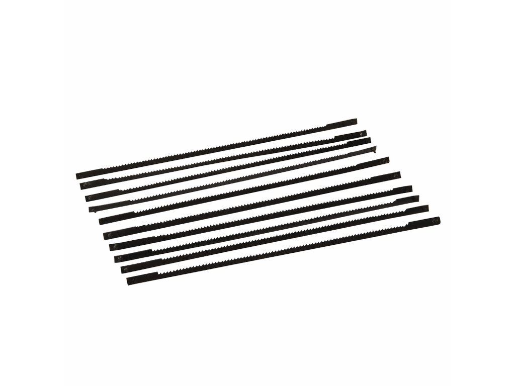Kalená uhlíková oceľ. Listy sú vhodné na rezanie dreva, plastov a neželezných kovov. Šírka 3 mm, hrúbka 0,4 mm, dĺžka 130 mm, 21 zubov na palec.