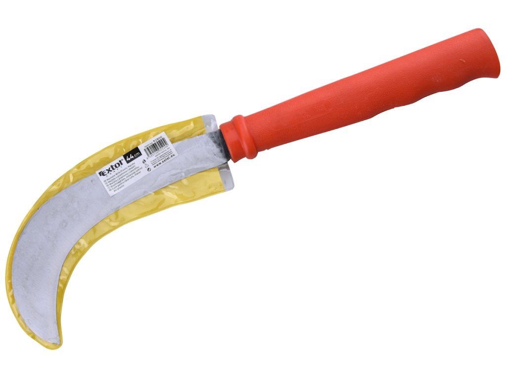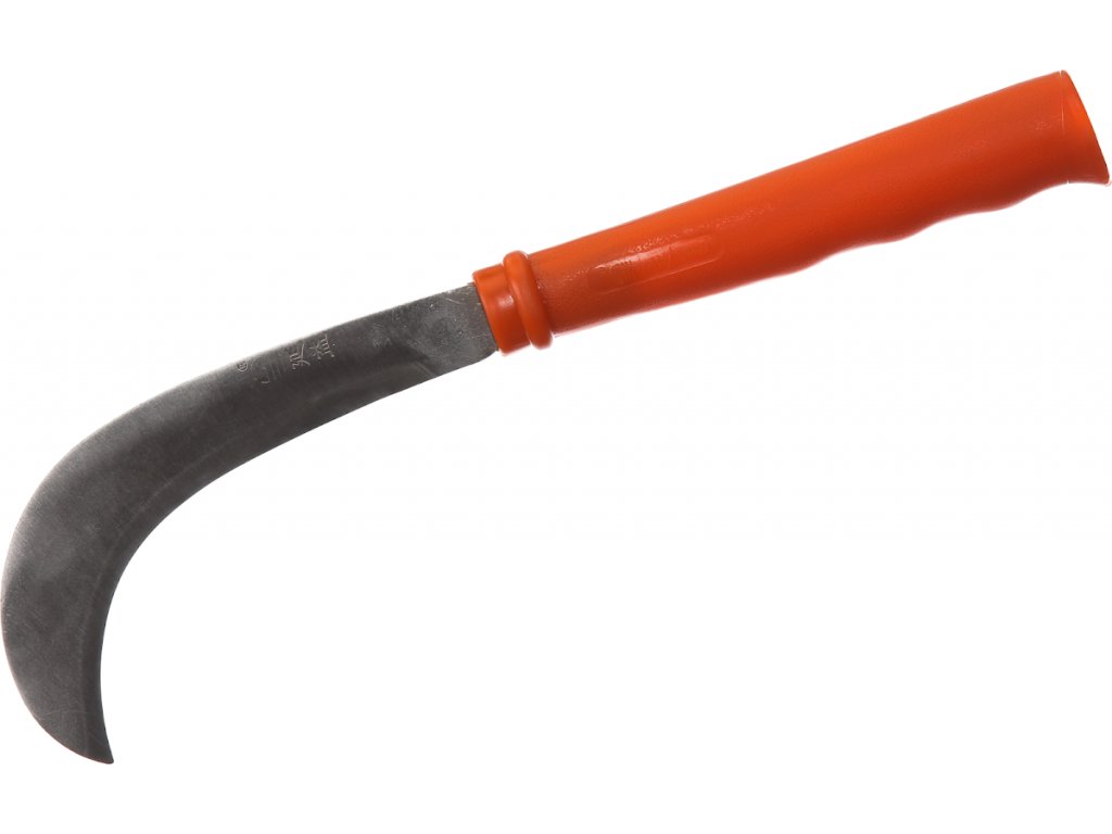 Nástroj vhodný na sekanie porastov, zahnutý tvar, dĺžka 440 mm, plastová rukoväť.