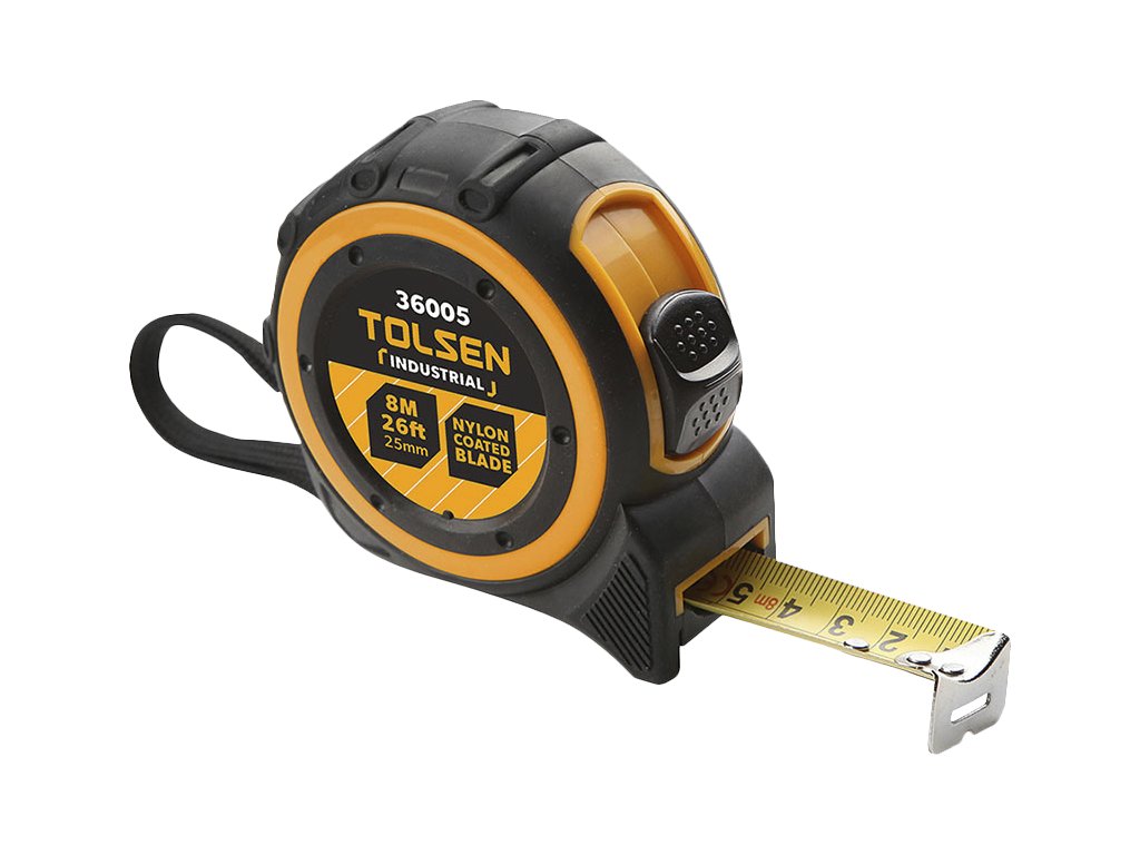 Kvalitný zvinovací meter odolný proti nárazu, plastové telo potiahnuté gumou, veľké tlačidlo na samonavíjací mechanizmus, trieda presnosti II, metrická a palcová stupnica, rozmery 5 000 × 25 mm.