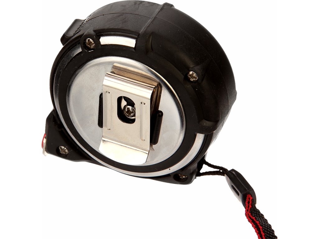 Ergonomické teleso z nehrdzavejúcej ocele potiahnuté gumou, trieda presnosti II, prehnutý pás pre väčšiu pevnosť vo vysunutej polohe, sila 0,135 mm, šírka 16 mm, ochranná nylonová vrstva, magnetický háčik, samonavíjací mechanizmus, pútko, kovová spona na zavesenie metra za opasok.
