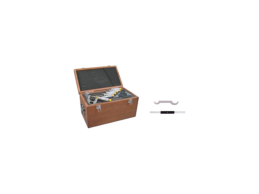 Súprava 6 ks analógových mikrometrov s rapkáčom ASIMETO obsahuje: – 0 – 25 mm – obj. č. 101010, – 25 – 50 mm – obj. č. 101020, – 50 – 75 mm – obj. č. 101030, – 75 – 100 mm – obj. č. 101040, – 100 – 125 mm – obj. č. 101050, – 125 – 150 mm – obj. č. 101060. Vlastnosti: Rovinnosť tvrdokovových meracích plôch 0,6 µm. Sivým lakom potiahnutý oceľový rám. Základné príslušenstvo: S kľúč, základné mierky, záručný list, návod na použitie, kalibračný certifikát, drevené puzdro.