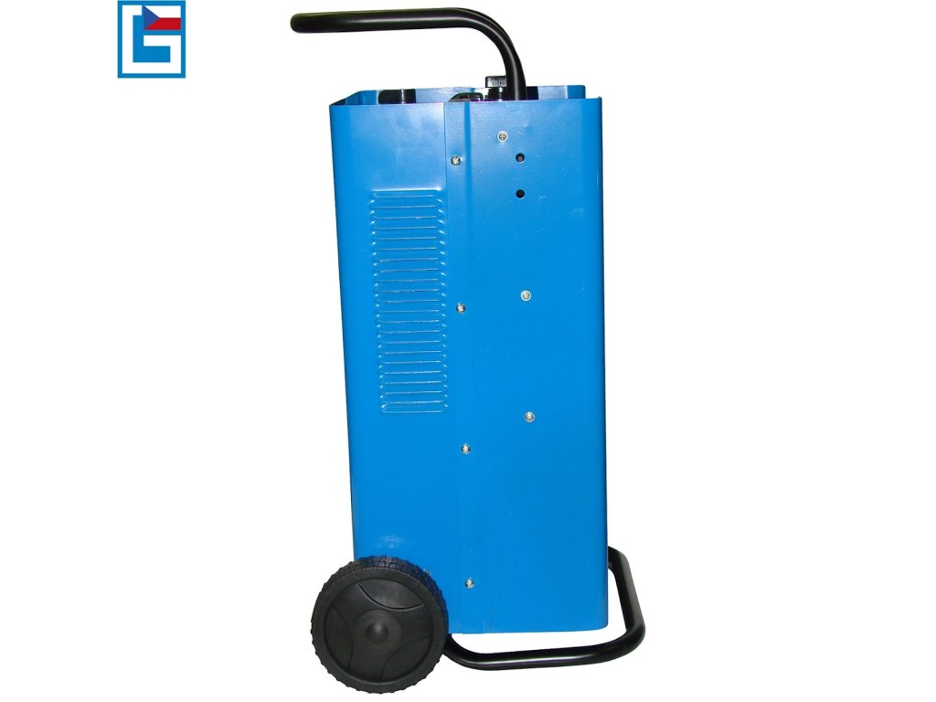 Konštrukcia: obslužný panel s ampérmetrom/časovačom/pólovými prípojkami 12/24 V, nabíjacie káble so svorkami, korpus nabíjačky z oceľového plechu, praktický box na ukladanie káblov, predný oporný rám, pojazdové kolesá a transportné madlo na uľahčenie manipulácie s nabíjačkou.