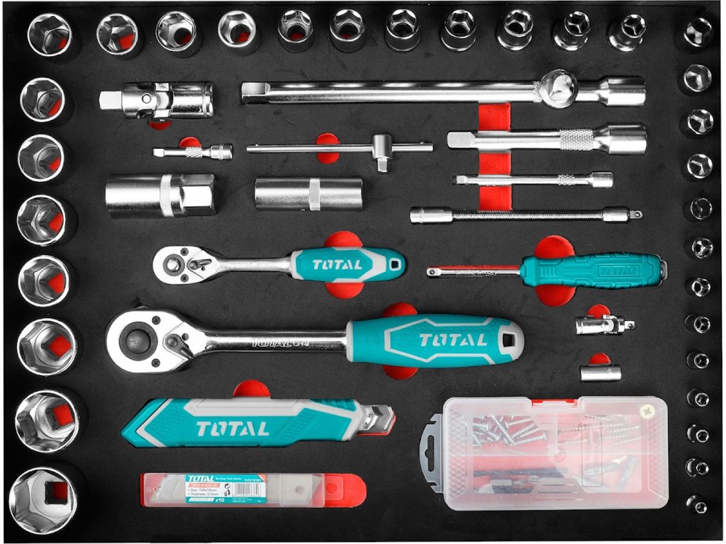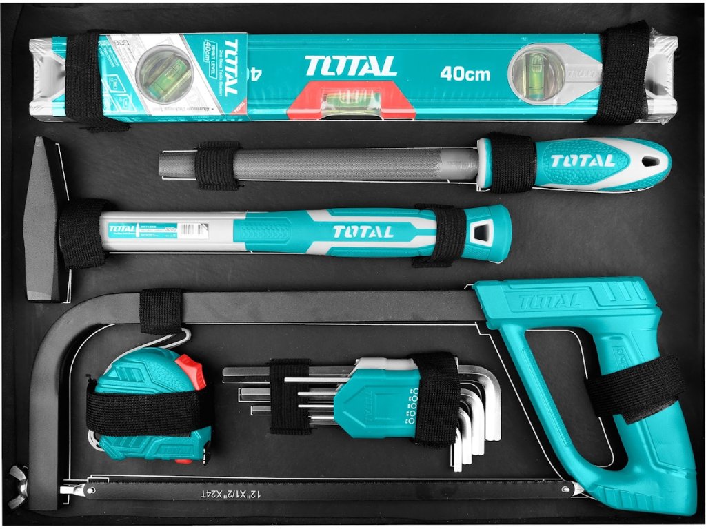 Bohatá sada obsahujúca najrôznejšie ručné náradie od klieští, cez gola sadu až po vodováhu. Všetko uložené v praktickom kurfe s kolieskami a výsuvnou rukoväťou.