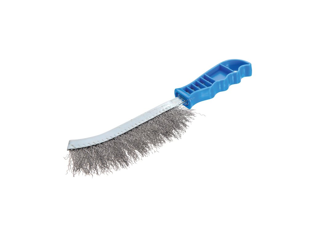 Oceľová drôtená kefa s plastovou rukoväťou, vhodná najmä na prípravu a začisťovanie zvarov. Dĺžka 240 mm.
