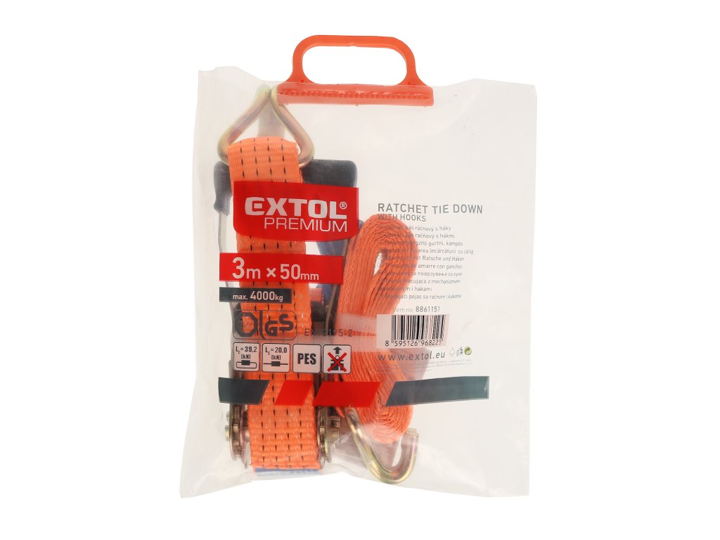 Je vybavený račňou s pogumovanou rukoväťou a hákmi. Maximálne zaťaženie 4 000 kg, pevnosť pásu pri opásaní 39,2 kN, v ťahu 19,6 kN, pretiahnutie pri maximálnom zaťažení 7 %; dĺžka dielu s račňou 0,5 m. Materiál pásu: 100 % polyester (PES).