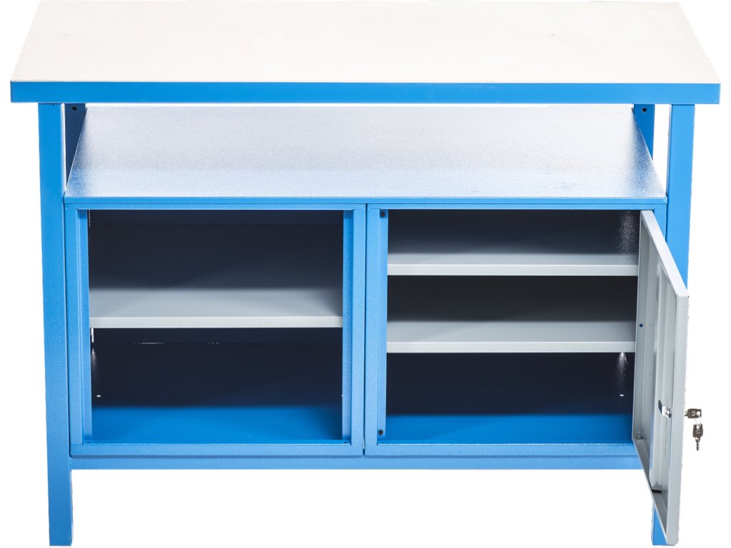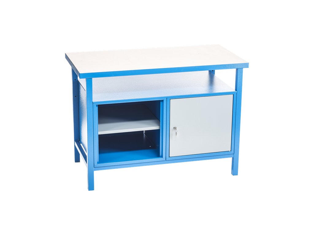 Pracovná doska je obojstranne dyhovaná (buk), vnútri vysokozhutnená drevotrieska, zváraný rám z oceľového profilu 40 × 40 s práškovým náterom, pozinkované dno s priehradkami, stôl montovaný. Vybavenie: dvere s valcovou zámkou, v skriňovej časti 1 odkladacia plocha, v otvorenej časti 1 odkladacia plocha na dne.