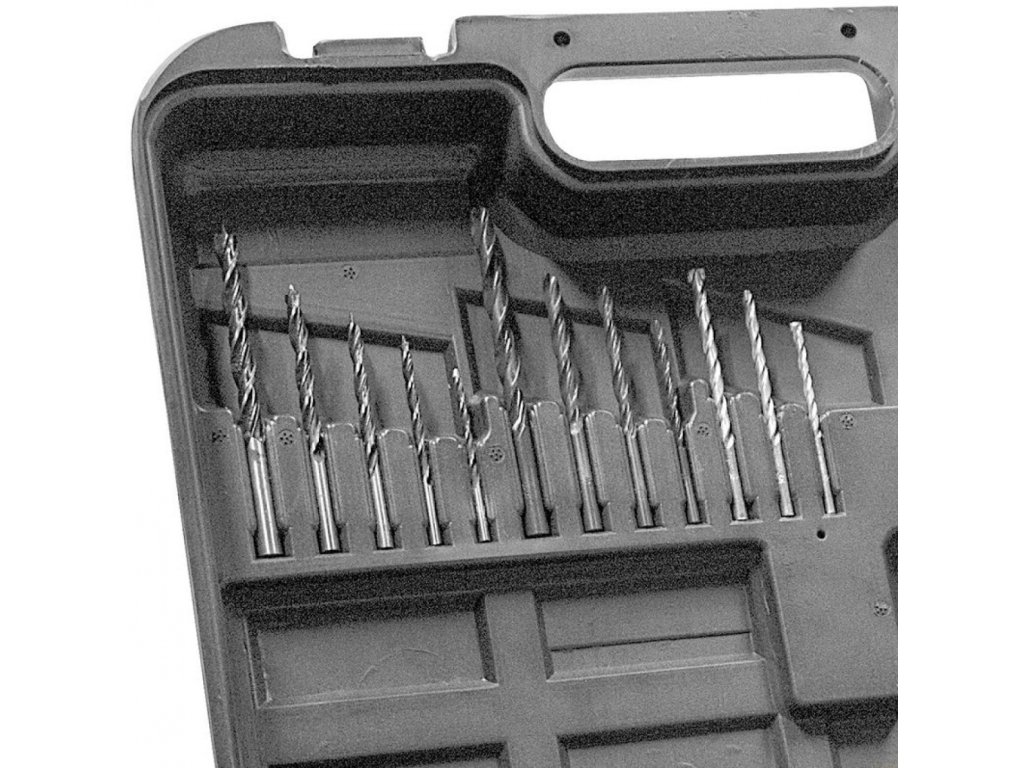 Príslušenstvo: vrtáky do dreva/kovov/kameňa (→ 12-dielna sada, priemery: 3/4/5/6 - 8 mm), plastový transportný kufrík.