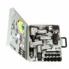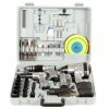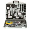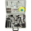 Rázový uťahovač 1/2" 310 Nm, excentrická brúska 150 mm, pneumatické kladivo, stopková brúska, pneumatická vŕtačka do 10 mm na drevo aj kov (Ľ/P chod), stranový kľúč, olejnička, 10 hlavíc 9, 10, 11, 13, 14, 17, 19, 22, 24 a 27 mm, predlžovací nadstavec, kotúč pre brúsku, 2 kľúče, 5 ks brúsnych kameňov 3 mm, 5 ks brúsnych kameňov 6 mm, klieštinové skľučovadlo, pružina pre pneumatické kladivo, sekáče pre pneumatické kladivo, kľuka pre skľučovadlo, skrutkovacie nadstavce, kufrík.