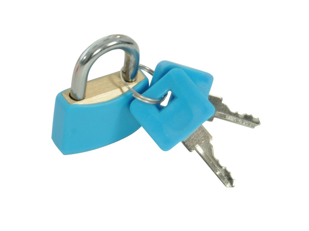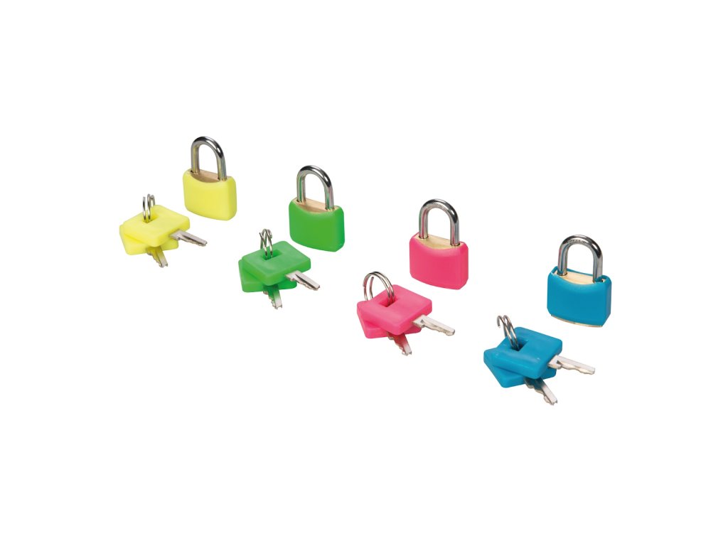 Každá sada obsahuje 4 ks 20 mm mosadzných visiacich zámkov s 2 mosadznými kľúčmi v reflexných PVC puzdrách. Chrómované oceľové strmene.