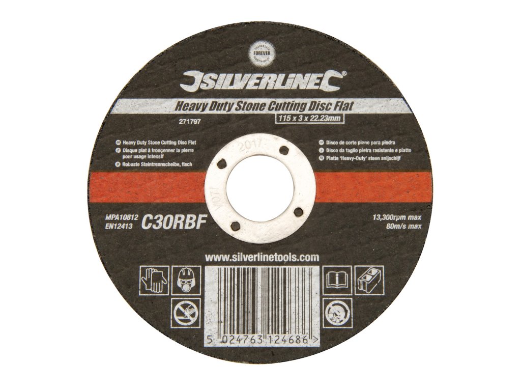 Rezný kotúč z karbidu kremíka vystužený skleným vláknom prvotriednej kvality. Dlhá životnosť a rýchle, presné rezanie kameňa, dosiek, dlaždíc, tehál a tvárnic. Vyrobené a certifikované podľa EN12413 so schválením MPA. Vhodné pre všetky uhlové brúsky. Maximálne otáčky 13 300/min.