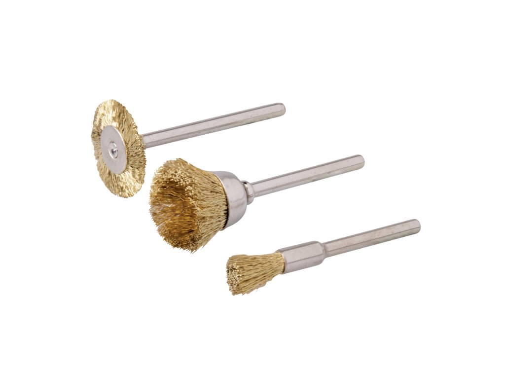 Súprava rotačných mosadzných drôtených kief 3dielna Mäkké mosadzné drôtené kefy na čistenie, leštenie a prípravu povrchu. Použitie na kovy, zliatiny, keramiku, dlaždice, kameň, sklo, plasty, sklolaminát a drevo. Kompatibilný s väčšinou rotačných nástrojov vrátane Silverline, GMC a Dremel. Obsahuje bodovú, tanierovú a kotúčovú kefu. Vreteno 3,17 mm, max. 15 000 ot./min.