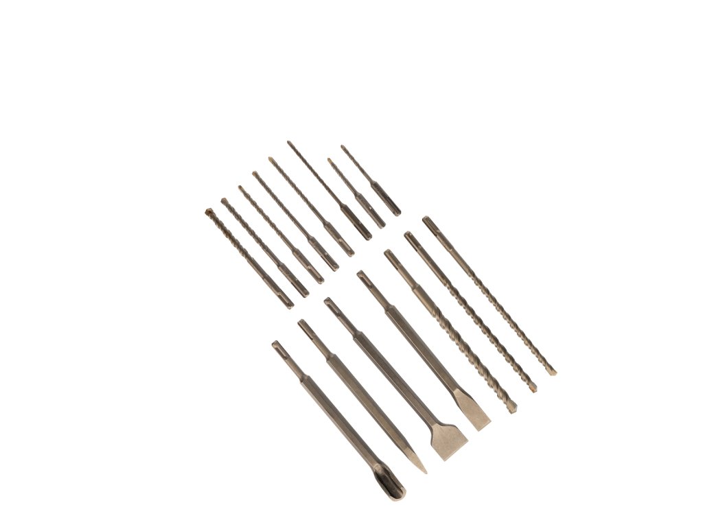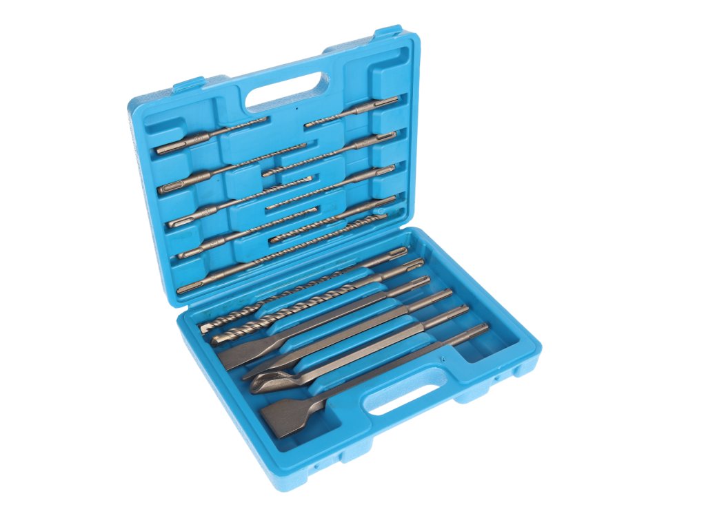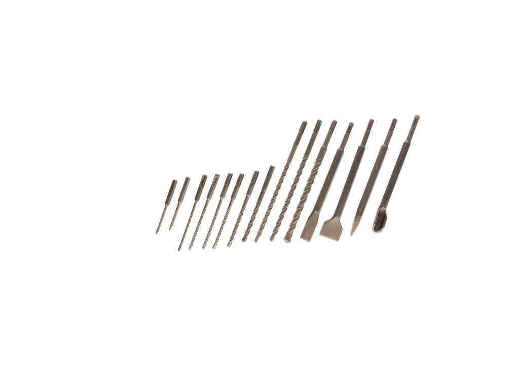 Obsahuje vrtáky: 5,5; 6 x 110 mm, 5,5; 6; 6,5 a 7 x 160 mm, 8; 10 x 160 mm, 10; 12 a 16 x 260 mm, sekáče: 1 x široký, 1 x špicatý, 1 x plochý a 1 x drážkovací. Dodávané v pevnom, plastovom puzdre.