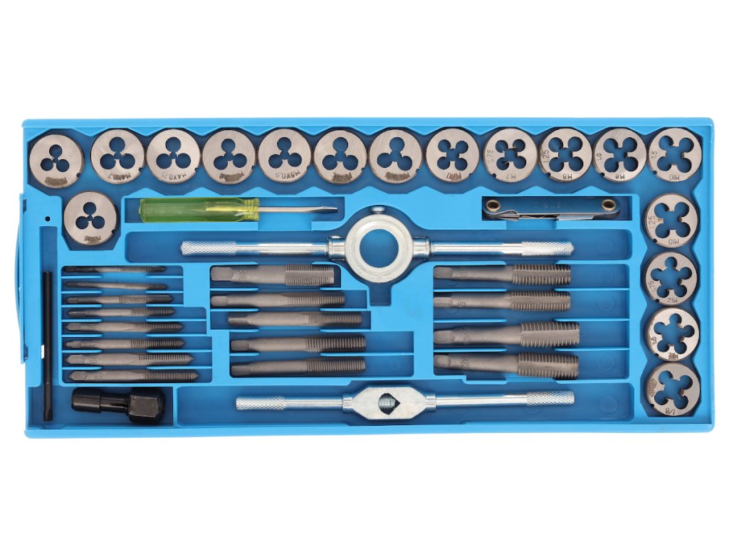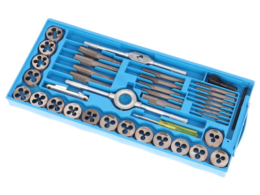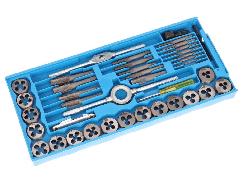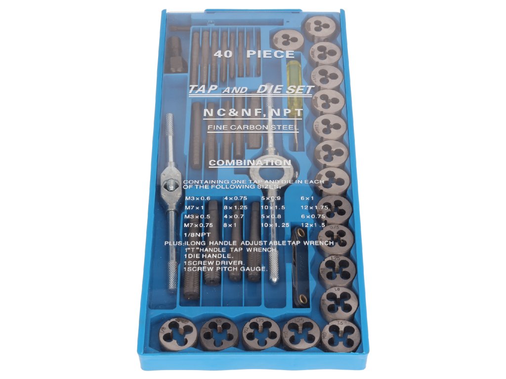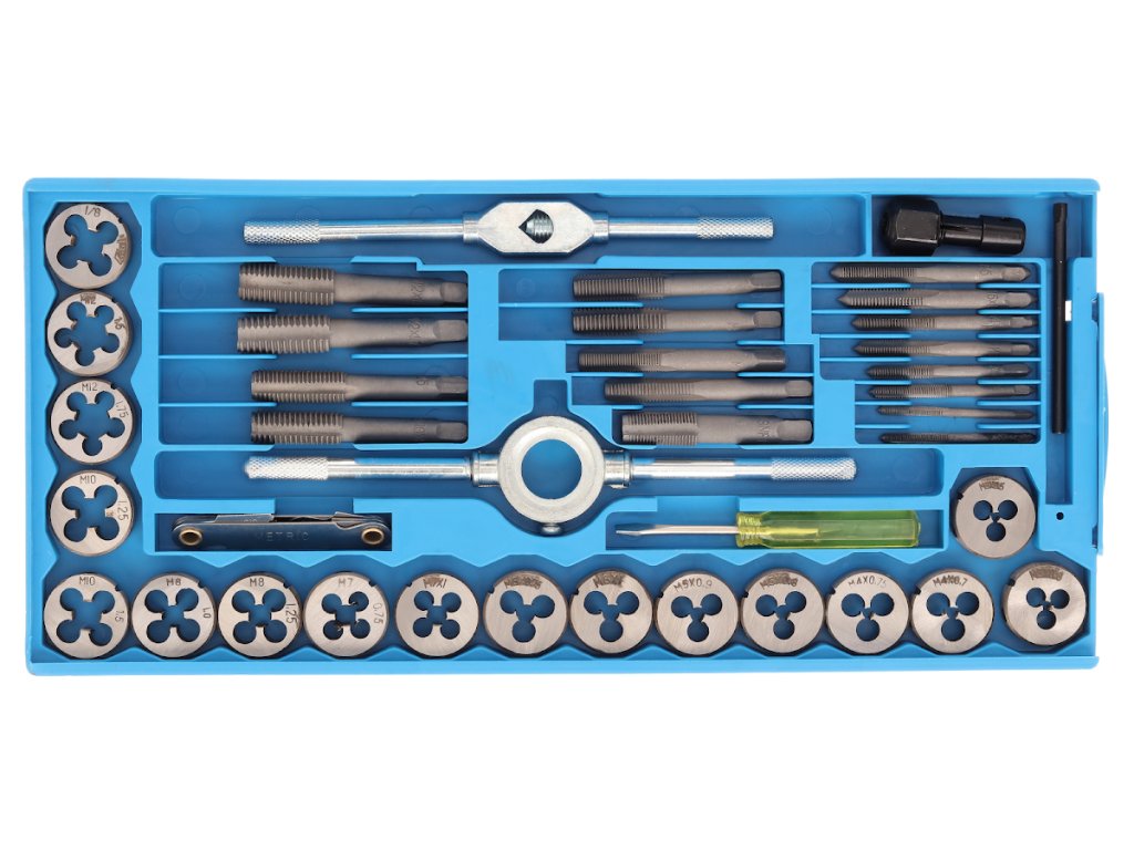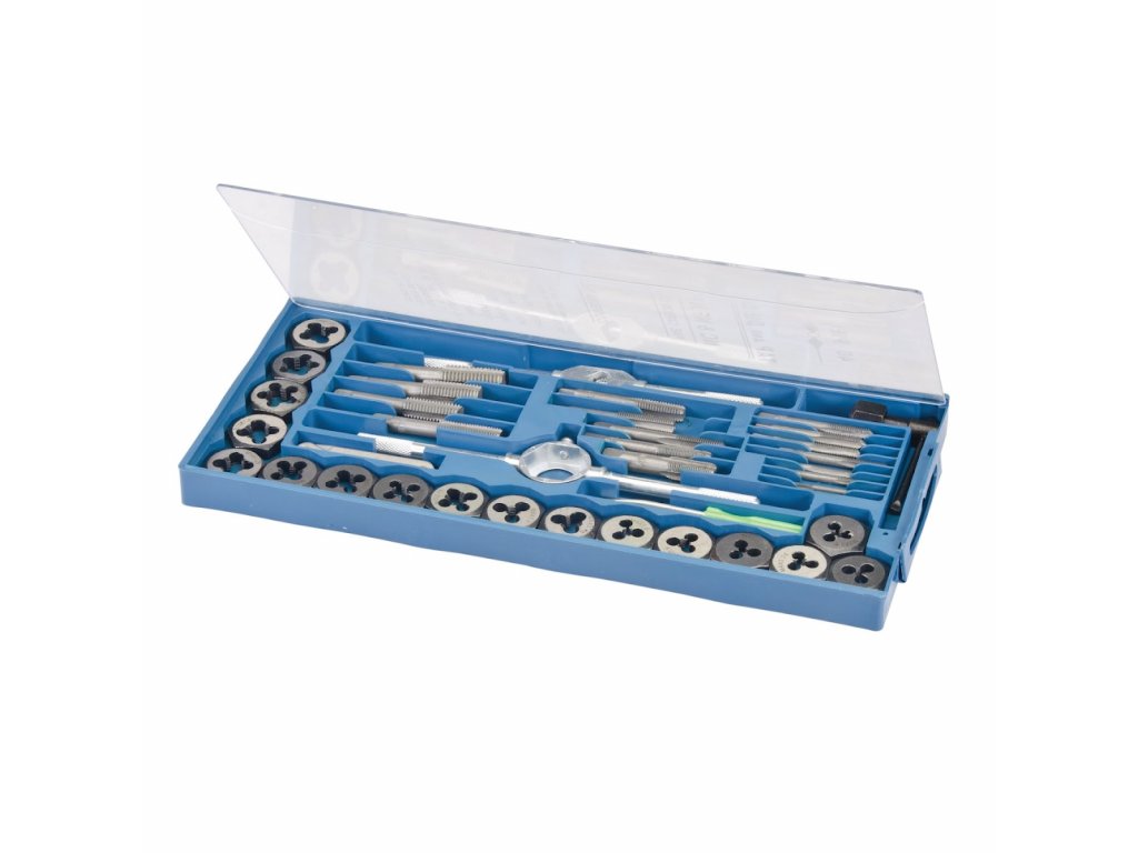 Závitníky a očká z uhlíkovej ocele na čistenie a rezanie vnútorných a vonkajších závitov. Súprava ďalej obsahuje tyčové vratidlo a vratidlo typu T pre závitníky a vratidlo pre očká, skrutkovač, mierka na zistenie veľkosti závitníkov a úložný kufrík. 16 metrických závitníkov a 16 metrických očiek: M3 x 0,5, M3 x 0,6, M4 x 0,7, M4 x 0,75, M5 x 0,8, M5 x 0,9, M6 x 0,75, M6 x 1, M7 x 0,75, M7 x 1, M8 x 1, M8 x 1,25, M10 x 1,25, M10 x 1,5, M12 x 1,5, M12 x 1,75 mm, 1 /8 "NPT očko a 1/8" NPT závitník.