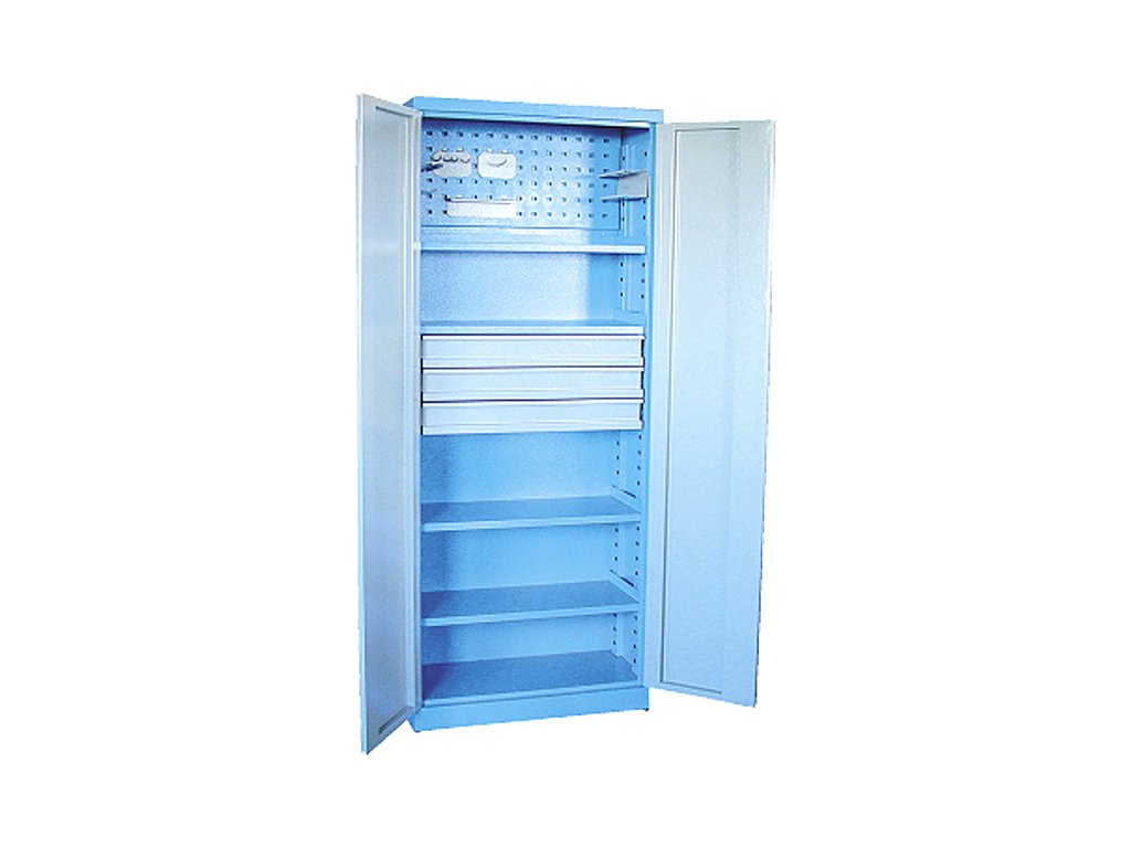 Celokovová už zmontovaná konštrukcia, prášková metalurgia, dizajn s oblými hranami. Závesy a uzatváracie tiahlo vnútri, rozvorová zámka, dvojité blokovanie, 4 police a 3 zásuvky, univerzálne prestaviteľné na hornej časti z vnútornej strany do výšky cca 340 mm, špeciálny dierovaný plech, s 2 držiakmi na nádoby, 1 držiak na náradie s 1 kolíkom a 1 držiak na náradie so 4 kolíkmi. Rozmery: šírka 780 mm × hĺbka 380 mm × výška 1 920 mm.