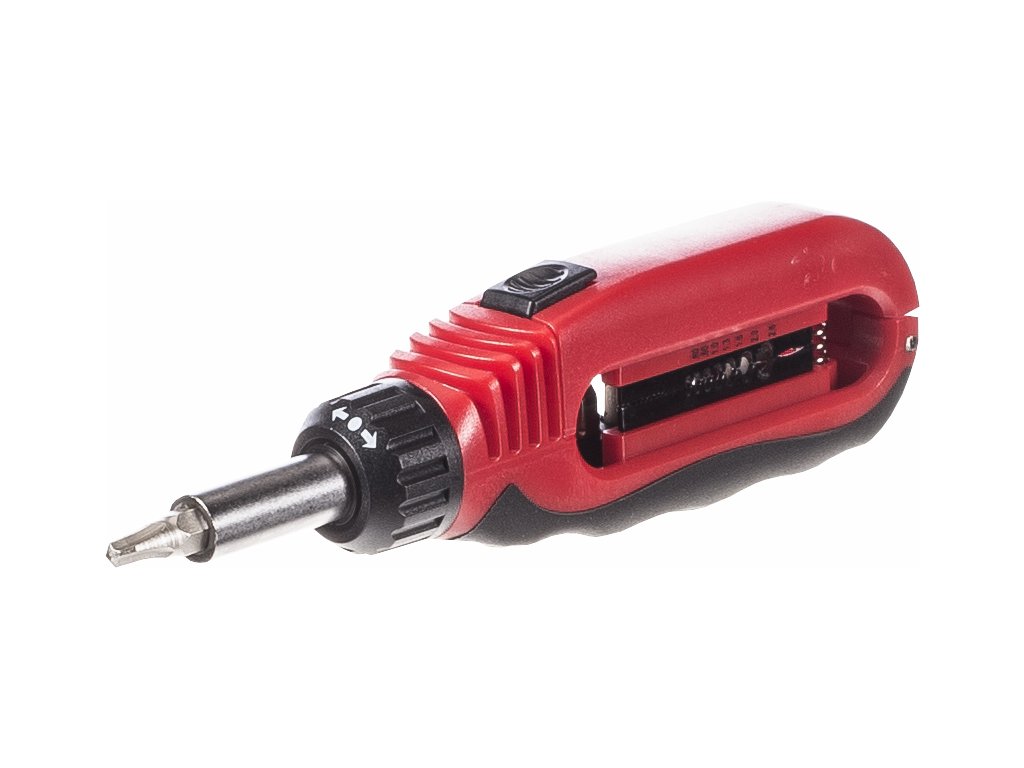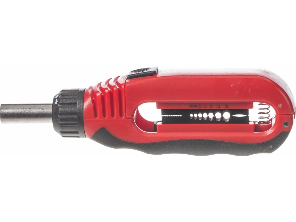 Odklápacia rukoväť ukrýva zásobník na 3 rovné a 3 krížové hroty s dĺžkou 25 mm a orezávač izolácie vodičov prierezu 0,6; 0,8; 1; 1,3; 1,6; 2 a 2,6 mm². Materiál rukoväti ABS + TPR, hrotov oceľ CRV. Balenie v blistri.