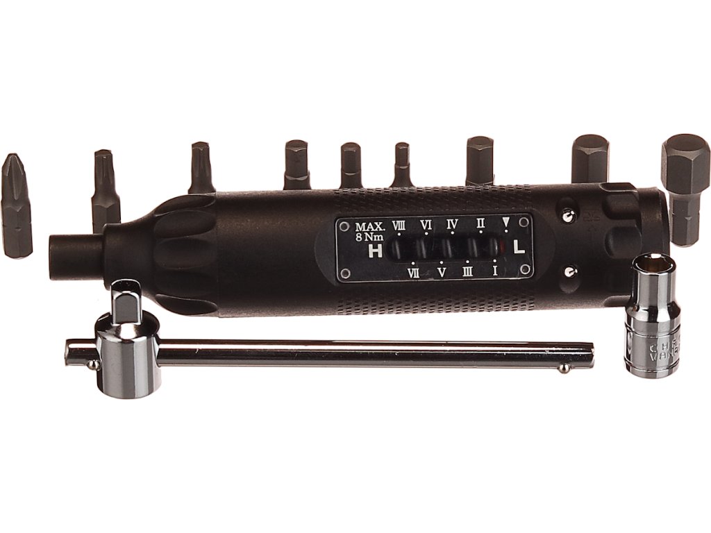 Súprava vhodná na opravy bicyklov obsahuje: skrutkovač s nastaviteľným momentom 1 – 8 Nm; 1/4" T-kus s 6 mm adaptérom na nastavovanie momentu; hroty 25 mm – inbus: 3; 4; 5; 6; 8 a 10 mm; T25 × 2 ks a PH2. Dodáva sa v praktickom puzdre.