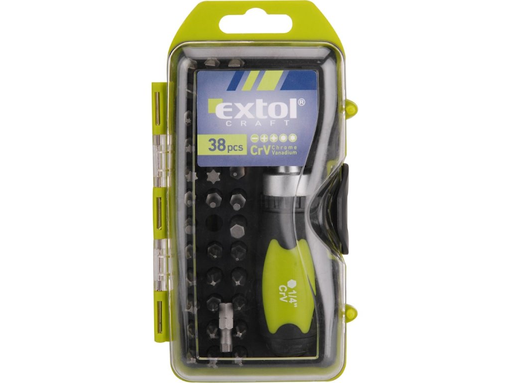 (-) 3 - 4 - 5 - 6 - 6 - 7 mm, PH 0 - 1 - 1 - 2 - 2 - 2 - 3 - 3, PZ 0 - 1 - 1 - 2 - 2 - 2 - 3 - 3, HEX 1,5 - 2 - 2,5 - 3 - 4 - 5 - 6 mm, T 8 - 10 - 15 - 20 - 25 - 27 - 30 - 40, račňový skrutkovač zakončený 1/4" šesťhranom