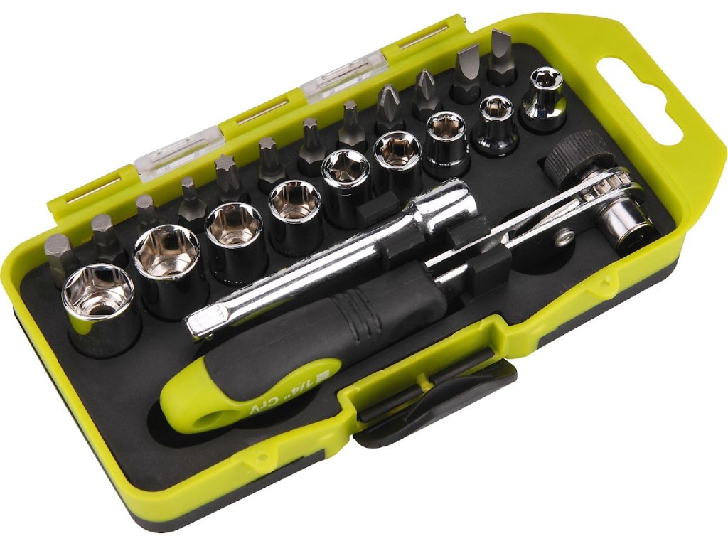 (-) 5 - 6 mm, PH 1 - 2, HEX 3 - 4 - 5 - 6 mm, T 15 - 20 - 25 - 30, hlavice 4 - 5 - 6 - 7 - 8 - 9 - 10 - 12 - 13 mm, 1/4" nástavec 75 mm, kombinovaná račňa zakončená 1/4" šesťhranom a štvorhranom na hlavice a bity