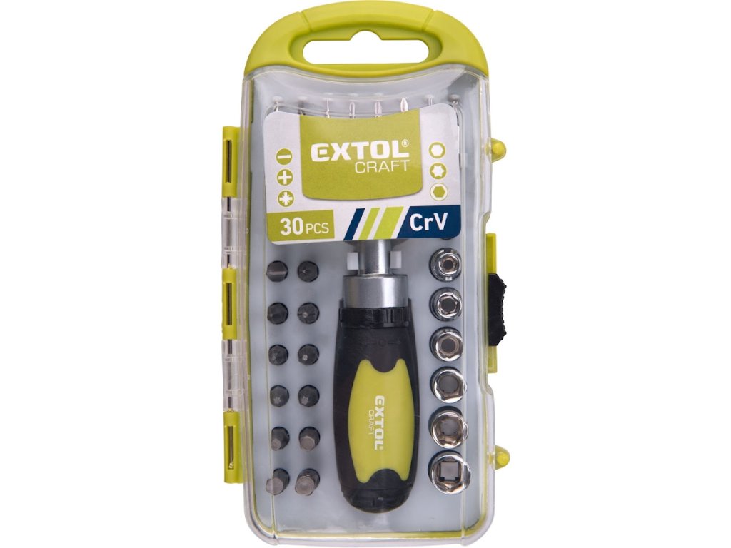 (-) 4 - 5,5 - 7 mm, PH 0 - 1 - 2, PZ 1 - 2, HEX 4 - 5 - 6 mm, T 10 - 15, hlavica 5 - 6 - 7 - 8 - 9 - 10 mm , mini hroty: (-) 2 - 2,5 - 3 mm, PH 000 - 00 - 0, T 6 - 8, adaptér mini hroty 5/32", redukcia na hlavice 1/4", račňový skrutkovač zakončený 1/4 šesťhranom