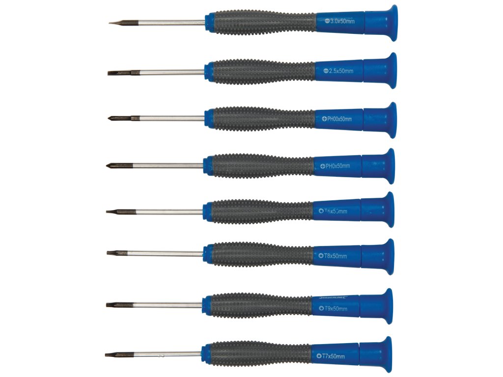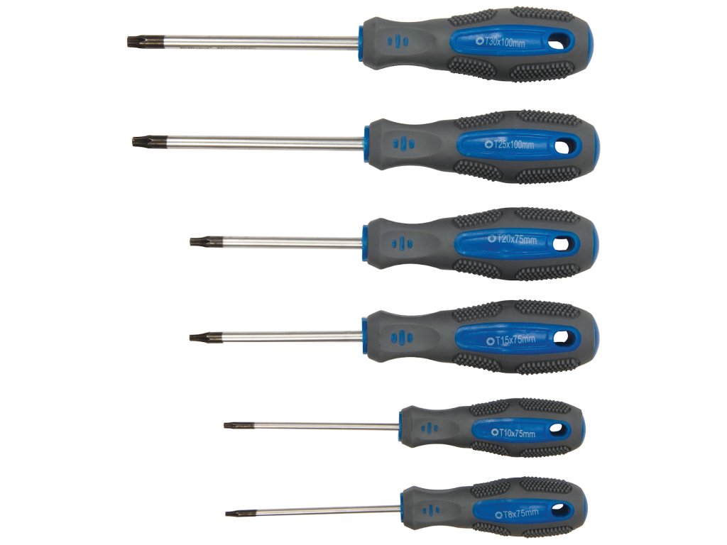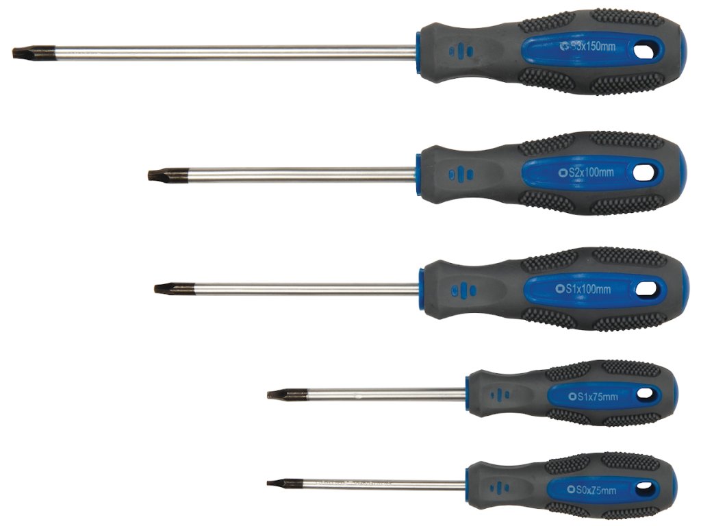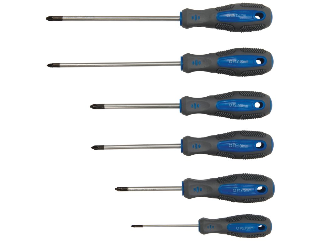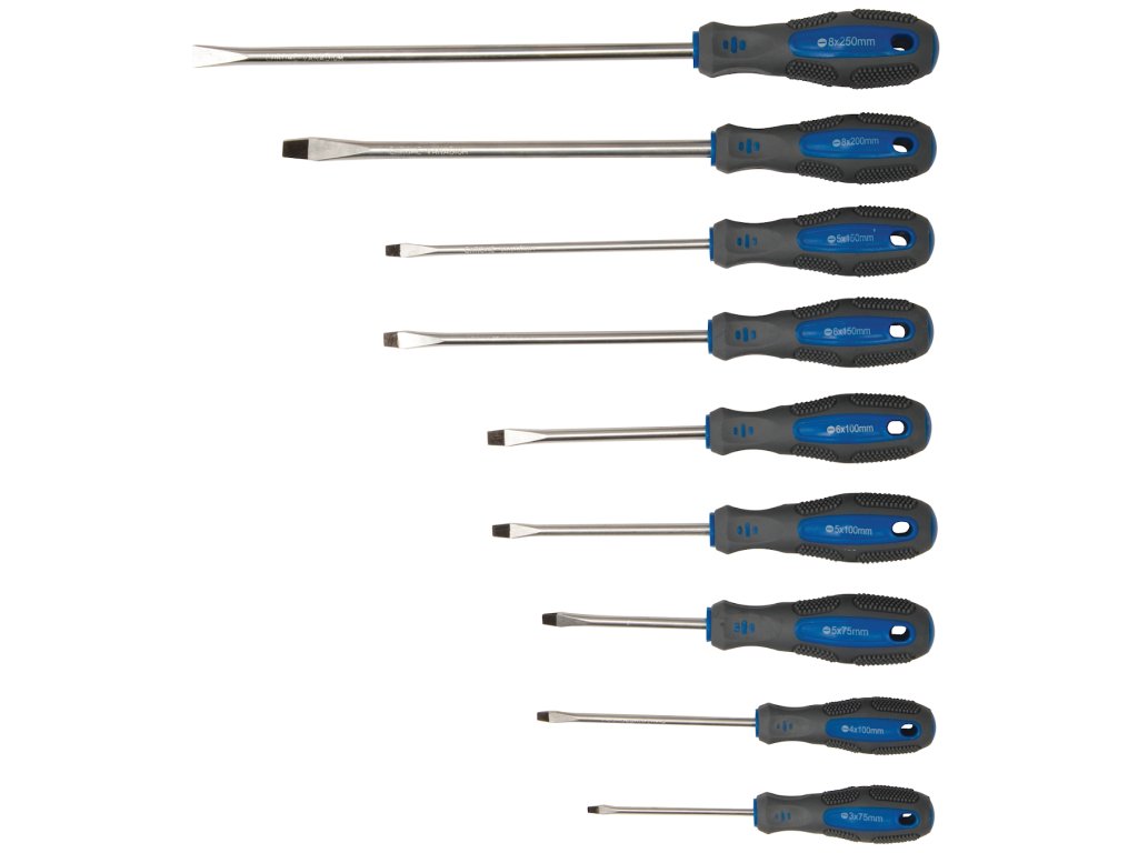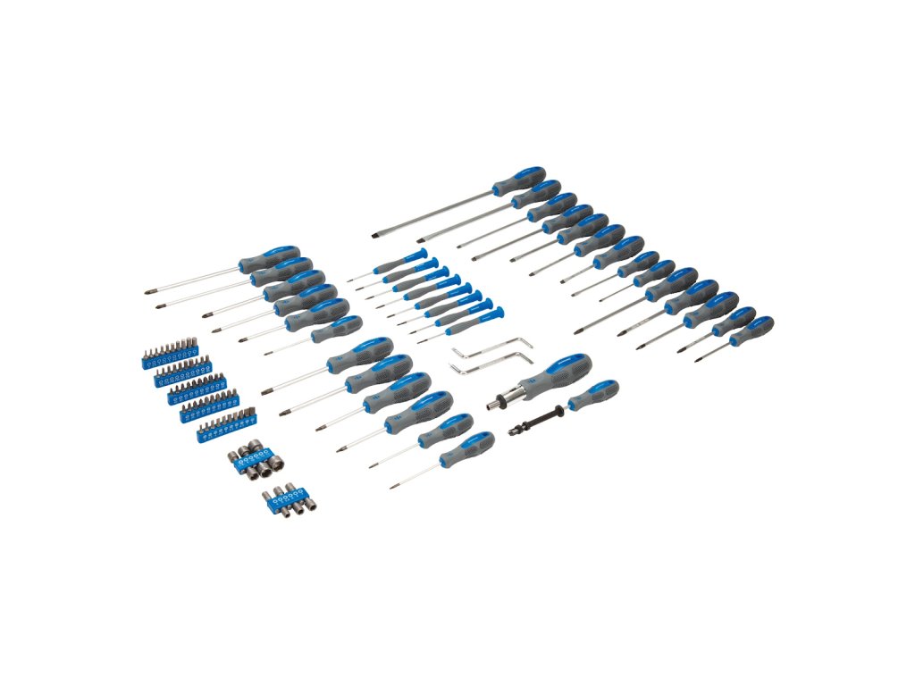 Súprava obsahuje: 9× plochý skrutkovač (3× 75, 4× 100, 5× 75, 5× 100, 6× 100, 5× 150, 6× 150, 8× 200, 8× 250 mm); 6× krížový (PZ0 × 75, PZ1 × 75, PZ1 × 100, PZ1 × 150, PZ2 × 100, PZ2 × 150 mm); 6× Torx (T8 × 75, T10 × 75, T15 × 75, T20 × 75, T25 × 100, T30 × 100 mm); 5× štvorec (S0 × 75, S1 × 75, S1 × 100, S2 × 100, S3 × 150 mm), 2× redukcia (SL6 × PH2, SL5 × PH1); 8× prenosný skrutkovač (SL2.5 × 50, SL3.0 × 50 mm, PH00 × 50, PH0 × 50 × 50 mm T6, T7 × 50, T8 × 50, T9 × 50 mm); 1× krížový skrutkovač s nástrčným kľúčom 4 × 100 a 1× nástrčný kľúč. Dodáva sa s 12 nástrčnými kľúčmi (4.0, 5.0, 5.5, 6.0, 6.0, 7.0, 8.0, 9.0, 10, 11, 12, 13 mm) a 50 ks hrotov (10× ploché, 10× PZ, 10× PH, 7× Trx, 3× štvorec a 10× imbus).