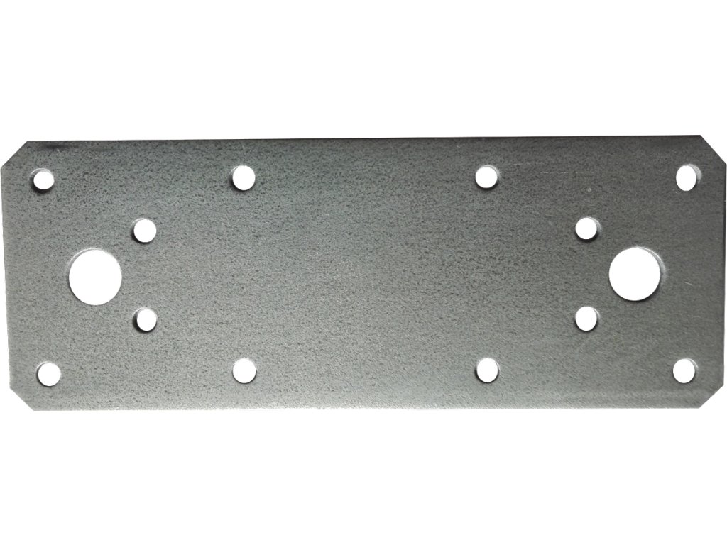 Oceľový pás na spojenie drevených častí konštrukcie. Rozmery 55 × 140 × 2,0 mm, vybavené otvormi s dvomi rôznymi priemermi pre spojovací materiál.