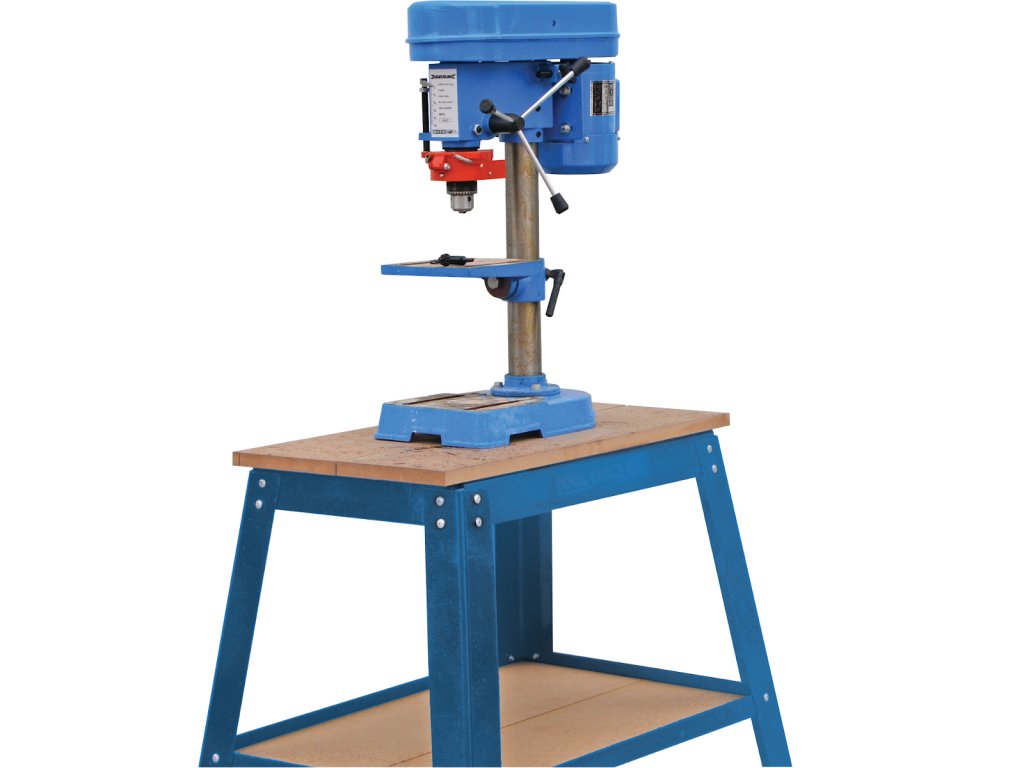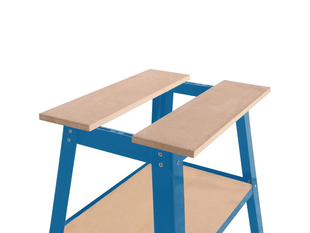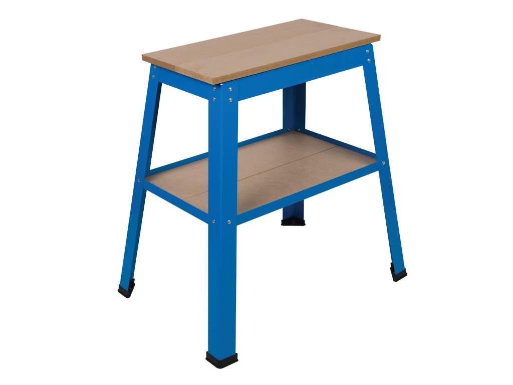 Stojan zo silného oceľového rámu, vstavané odkladacie police a odolná prášková farba na ochranu konštrukcie. Stojan – stabilná podpora pre stolové a pokosové píly a vŕtačky. Dvojdielna horná polica so značkami uhla a dĺžky, s rozsahom šírky 360 až 520 mm. Vhodná pre základne obrábacích strojov s rôznou veľkosťou. Gumené nožičky na zníženie vibrácií a ochranu pred poškodením povrchu.