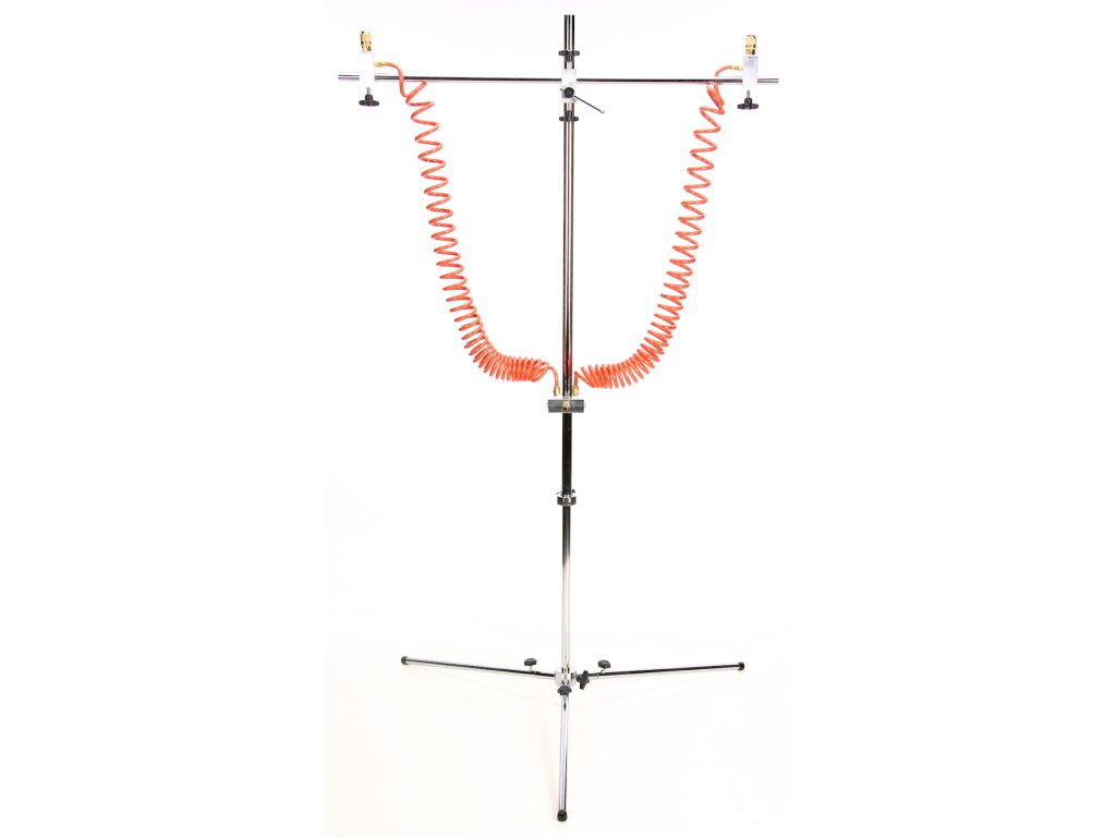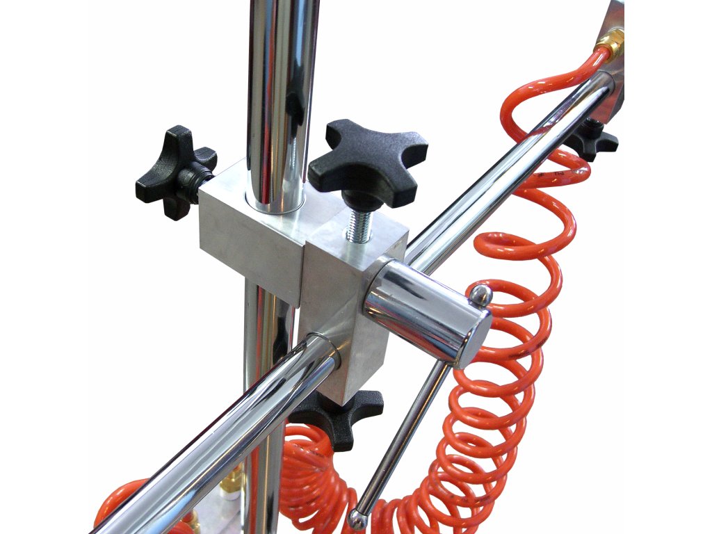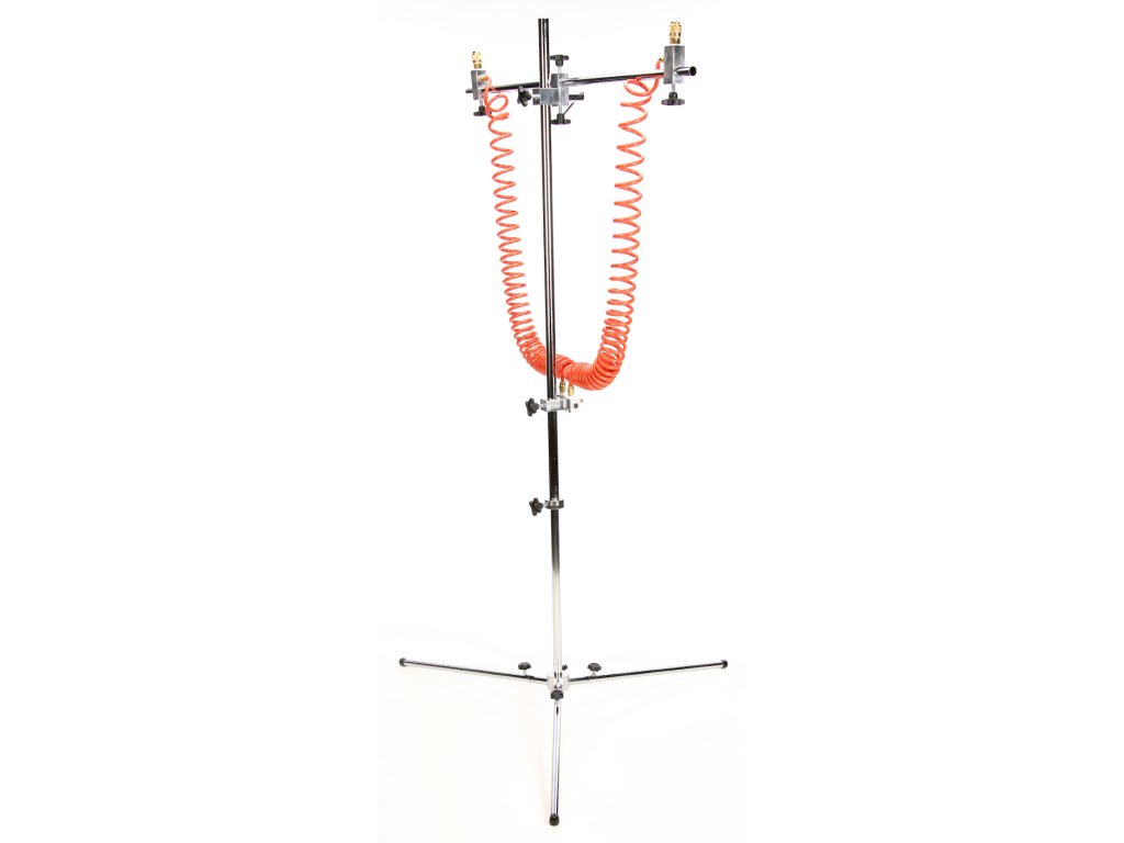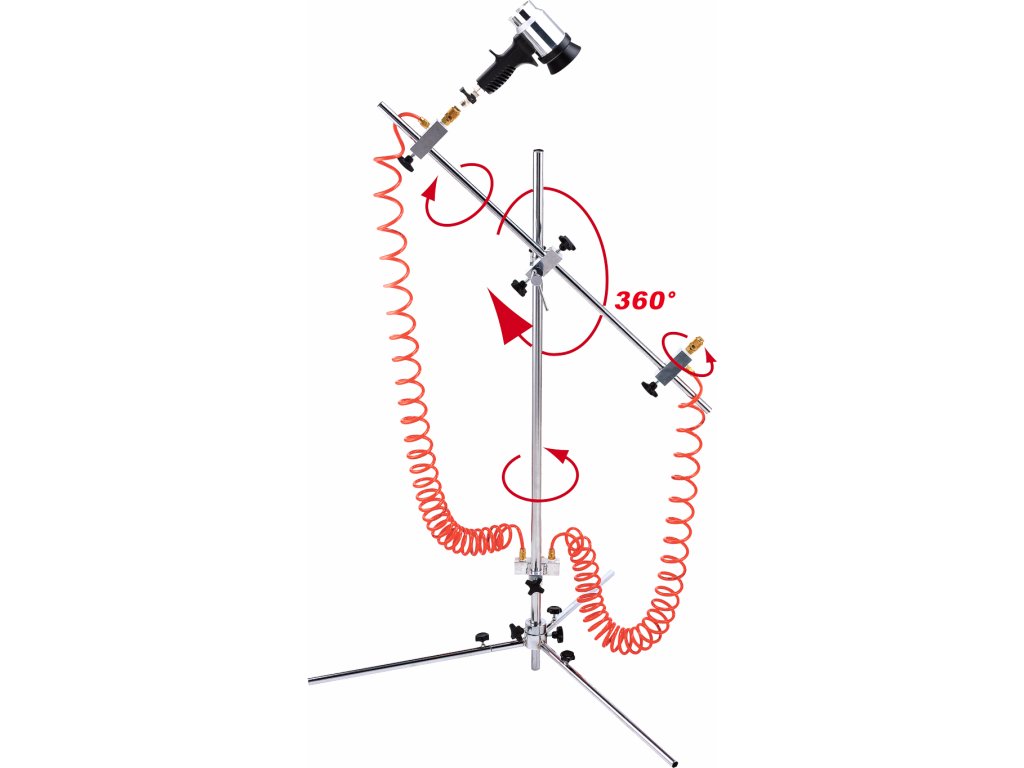 Otočný skladací stojan na upevnenie 2 ks vysúšacích pištolí. Užitočný pomocník pri vysúšaní väčších plôch a potrebe dlhšieho času zasychania, kde by ručná manipulácia nebola efektívna. Pištole možno upevniť a nastaviť v ľubovoľnej polohe a smere. Nastaviteľná výška 20 – 210 cm, balenie obsahuje rozdvojku a 2 ks špirálových hadíc (neobsahuje ofukovaciu pištoľ). Materiál pochrómovaná oceľ.