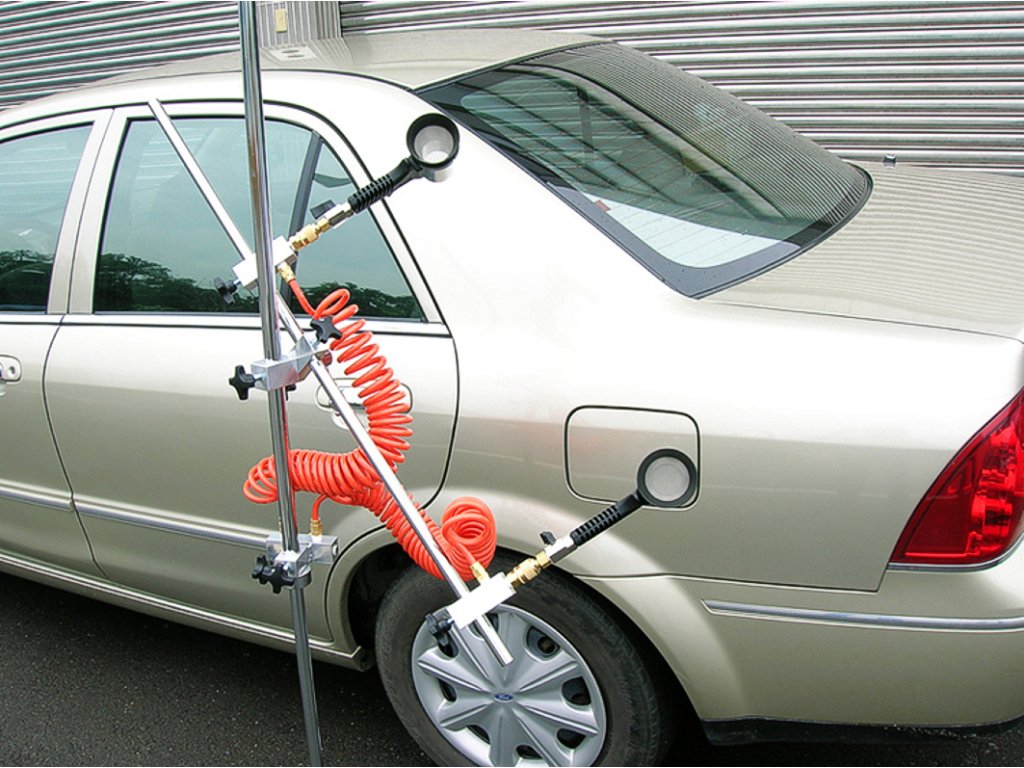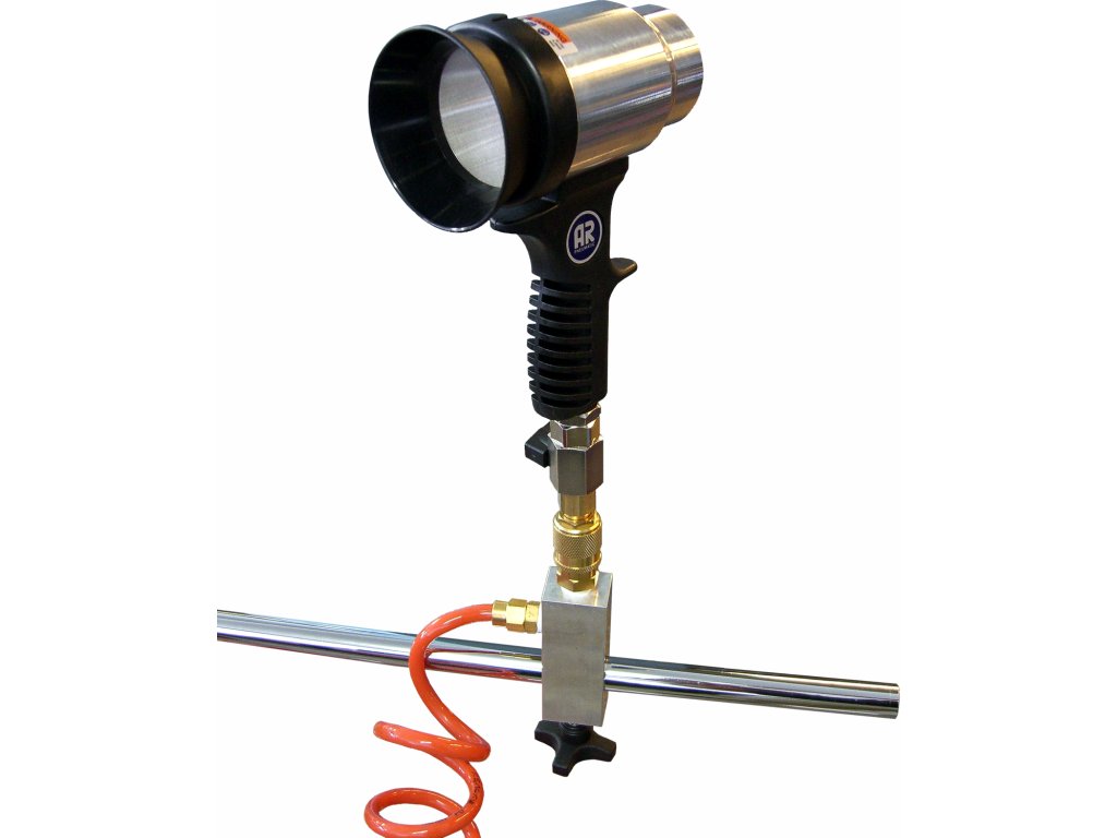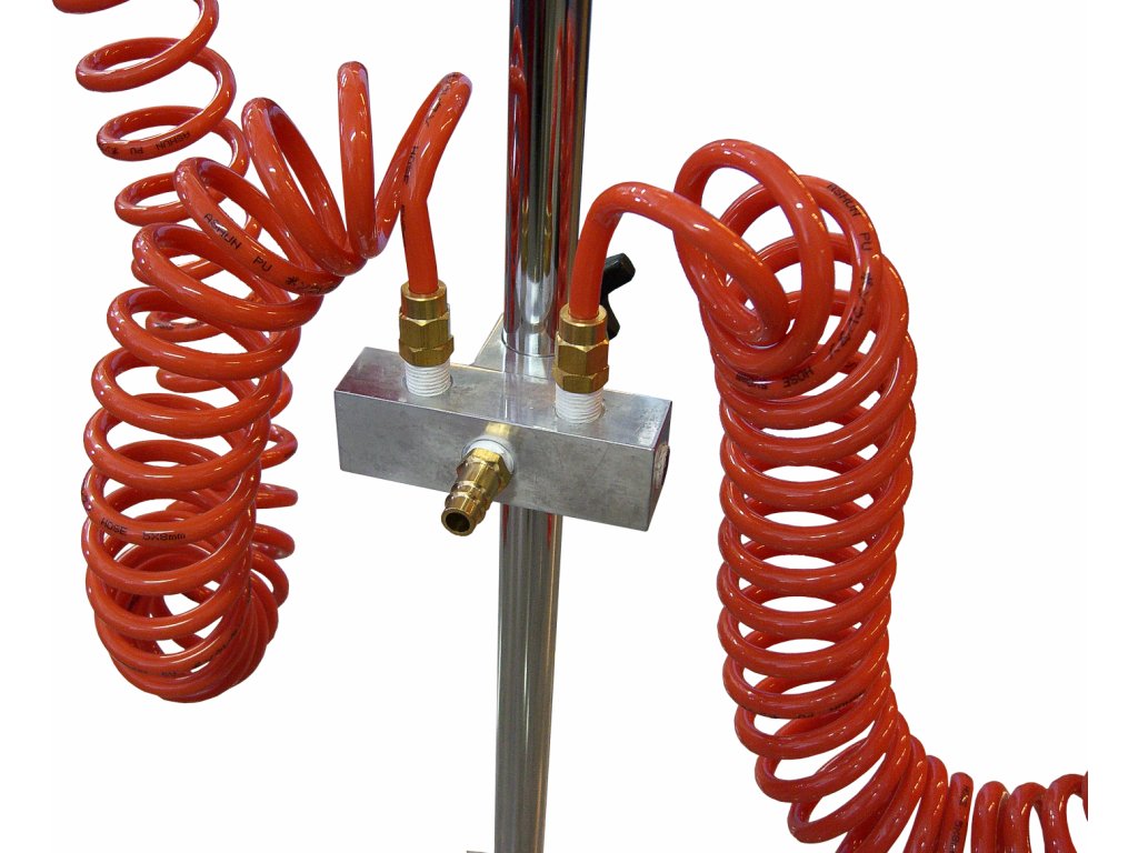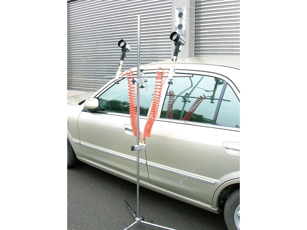 Otočný skladací stojan na upevnenie 2 ks vysúšacích pištolí. Užitočný pomocník pri vysúšaní väčších plôch a potrebe dlhšieho času zasychania, kde by ručná manipulácia nebola efektívna. Pištole možno upevniť a nastaviť v ľubovoľnej polohe a smere. Nastaviteľná výška 20 – 210 cm, balenie obsahuje rozdvojku a 2 ks špirálových hadíc (neobsahuje ofukovaciu pištoľ). Materiál pochrómovaná oceľ.