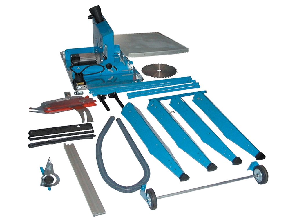 Plynulo nastaviteľná výška/uhol sklonu pílového kotúča 90° - 45° (→ rezy na pokos), pozinkovaný pracovný stôl (→ dx š: 800 x 553 mm), ľahká manipulácia vďaka pojazdovým kolesám/výklopným transportným rukovätiam.
