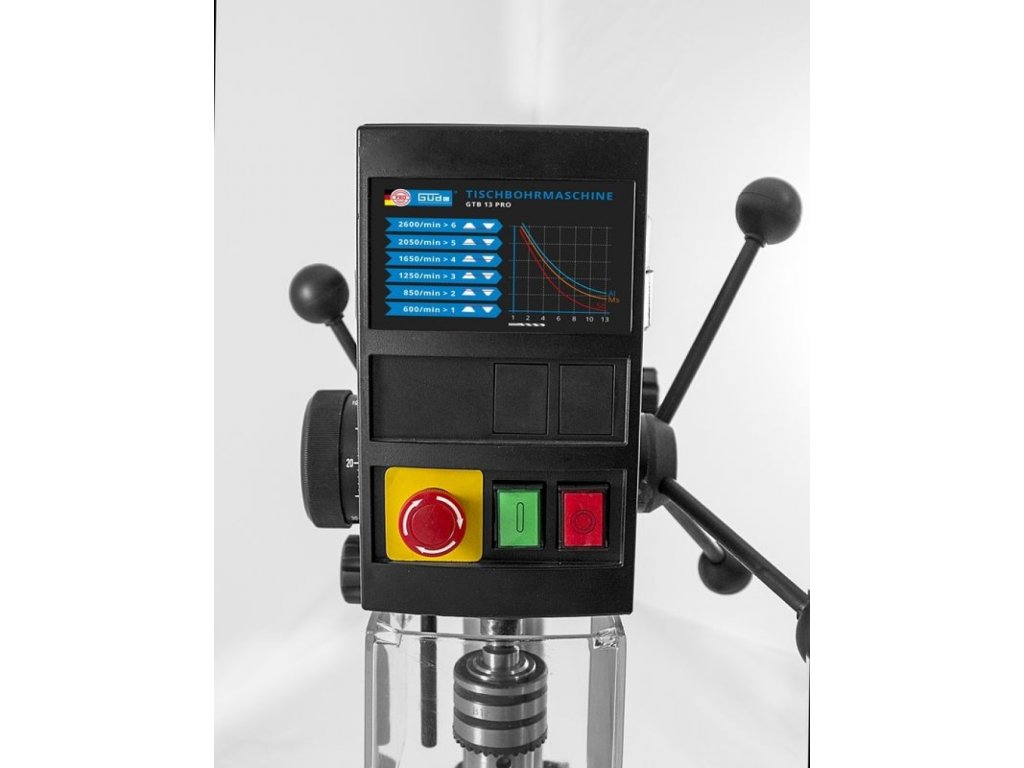 6 rýchlostných stupňov otáčania vretena (→ 600 - 2.600 min.-1; zmena otáčok manuálne pomocou remeníc), vŕtacia hlavička pre nástroje a vrtáky ø 1,5 - 13 mm (→ hádzavosť: < 0,02 mm).
