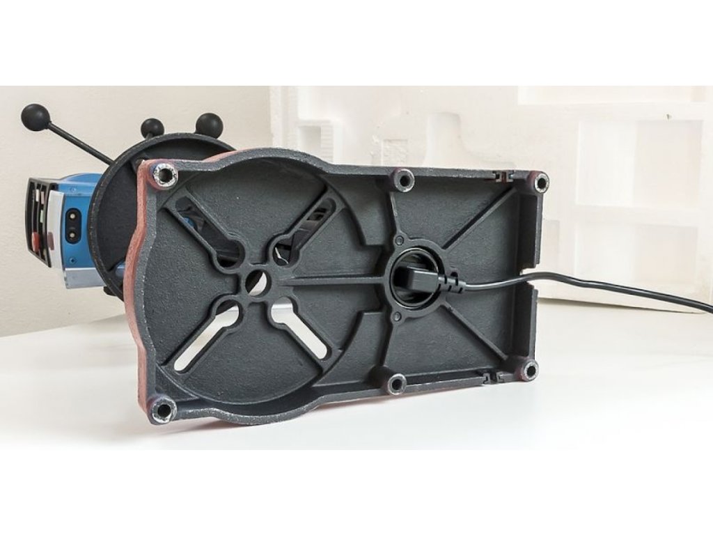 Konštrukcia: hliníkové remenice (2), vreteno s kónickým úchytom/presnými guličkovými ložiskami, otočný pracovný stôl (→ priemer: 170 mm; s drážkami na upevnenie zveráka), základná doska z liatiny (→ rozmery d × š: 190 × 330 mm; vrátane vývrtov pre stacionárne ukotvenie vŕtačky).
