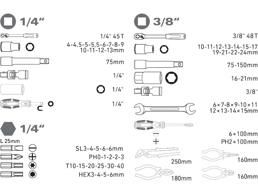 Súprava náradia 65 ks, 1/4", 3/8", CrV