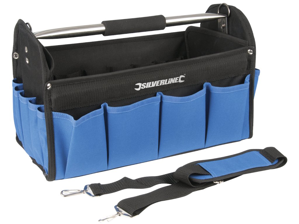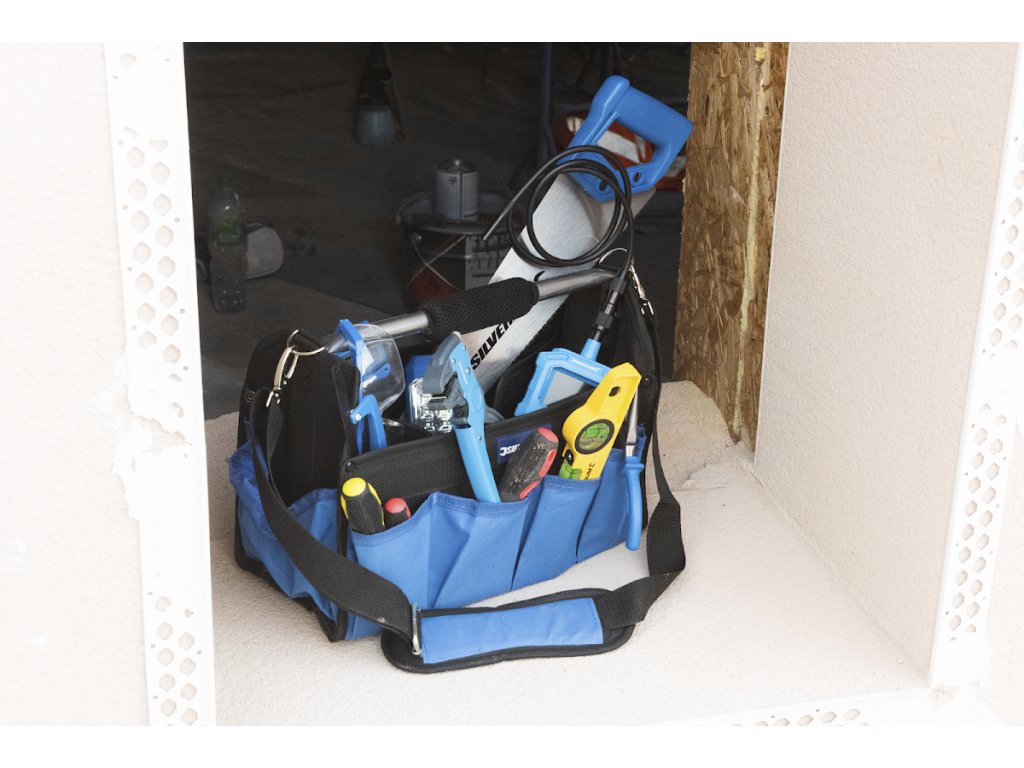 Robustná, vystužená konštrukcia z odolného nylonu. Otvorený tvar pre ľahký prístup k nástrojom. Obsahuje 10 × vonkajšie vrecká, 6 × elastické vrecká a veľké vrecko zo sieťoviny. Hliníková nosná tyč s pohodlnou rukoväťou z peny. Nastaviteľný ramenný popruh.