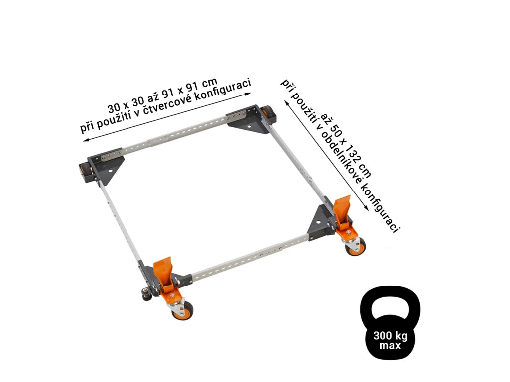 Univerzálny pojazdný podstavec s vysokou nosnosťou od značky BORA, vďaka ktorému budete môcť vaše nepojazdné náradie posúvať po dielni. Základňa BORA je plne nastaviteľná po 2,5 cm do švercového tvaru od 30 x 30 cm až do 91 x 91 cm. Je možné ju zložiť aj do tvaru obdĺžnika s maximálnymi rozmermi 51 x 132 cm. Má veľmi nízky profil - výšku vášho nepojazdného nástroja zvýši o menej ako 3 cm. Uzamykateľné páky a kolesá z tvrdej gumy udržia základňu pevne na svojom mieste až do doby, kedy s ňou budete potrebovať hýbať a kolesá jednoducho odbrzdíte. Základňa je kompatibilná aj so skrinkami na náradie, trezormi či pracovnými stolmi s maximálnou váhou až 295 kg. Vyrobené z ocele.
