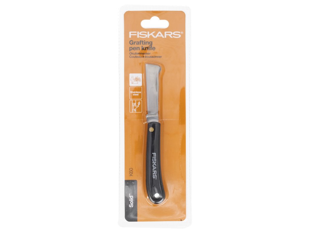 Nôž Secateur vyrobený z vysoko kvalitnej uhlíkovej ocele. Na očkovanie, rezanie a ošetrenie drevín a iných rastlín. Čepeľ vyrobená z vysoko kvalitnej uhlíkovej ocele. Plastová rukoväť s mosadzným nitom. Dĺžka: 170 mm. Hmotnosť: 50 g. Pôvodné číslo Fiskars: 125900. Označenie: K60