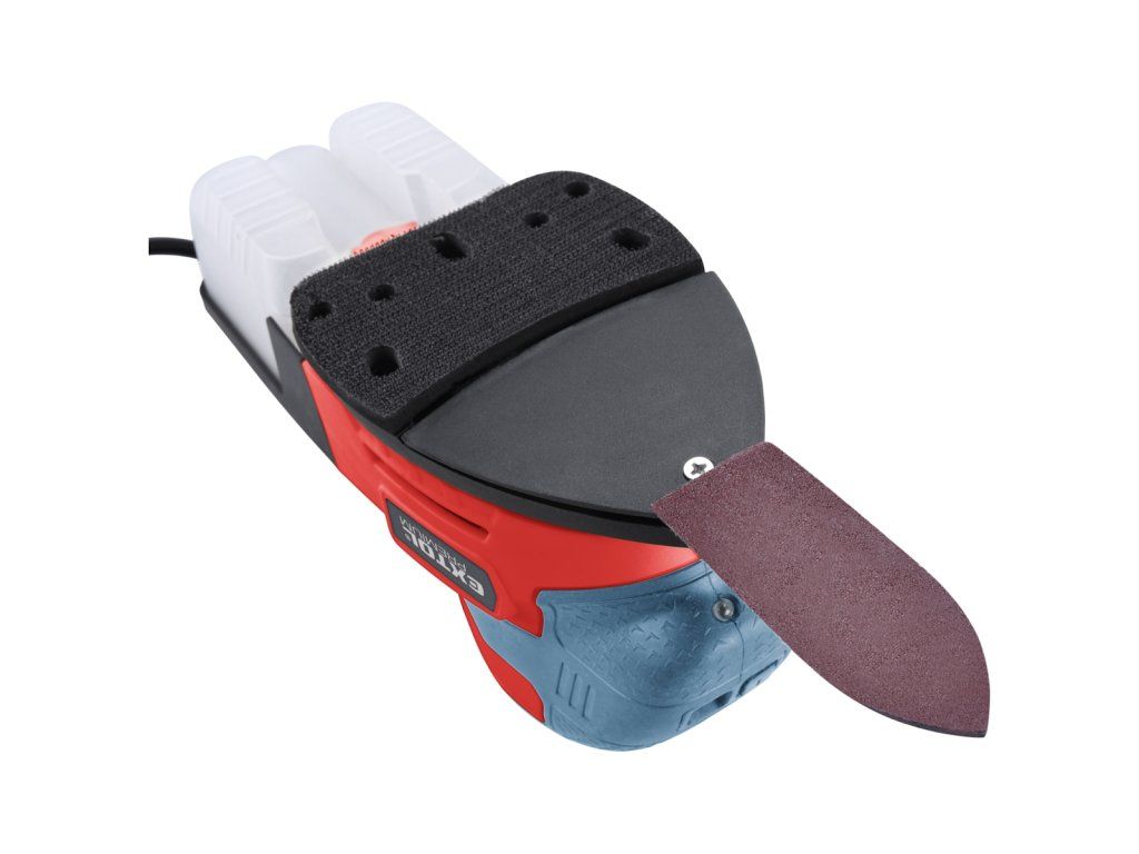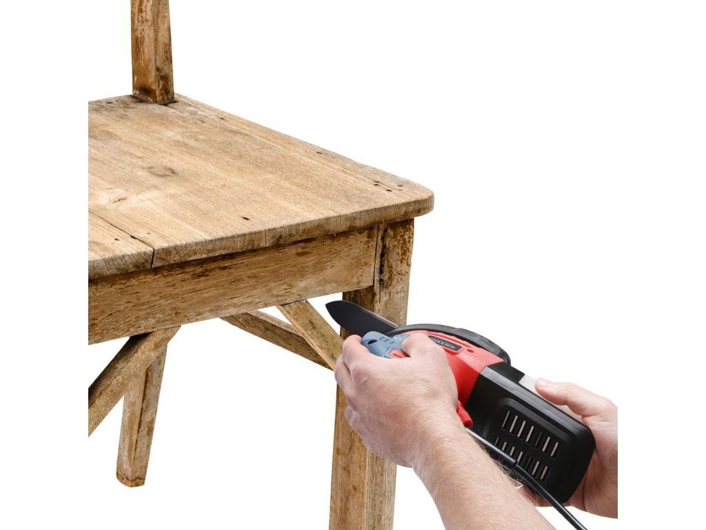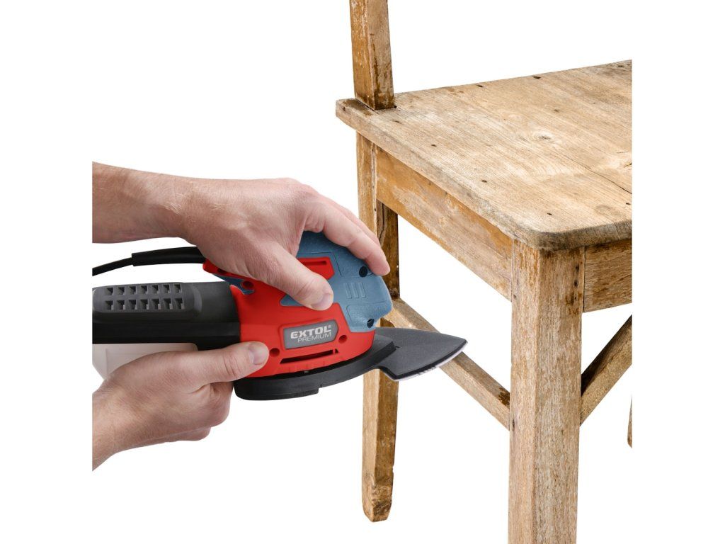 Vibračná brúska s uchytením brúsneho papiera na suchý zips je určená na brúsenie dreva a drevených materiálov, kovov a na zabrúsenie poškodených miest povrchovej úpravy, napr. farby a laku, ďalej tmelov a pod. bez použitia vody. Na základňu brúsky je možné nainštalovať tri typy nástavcov podľa požiadavky na dostupnosť brúseného miesta: